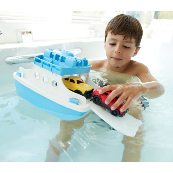 Two cars fit inside the ferry, driving up the slide-out ramp for a voyage across the sea or bathtub. Everything's made of 100% recycled plastic that is safe and easy to clean!