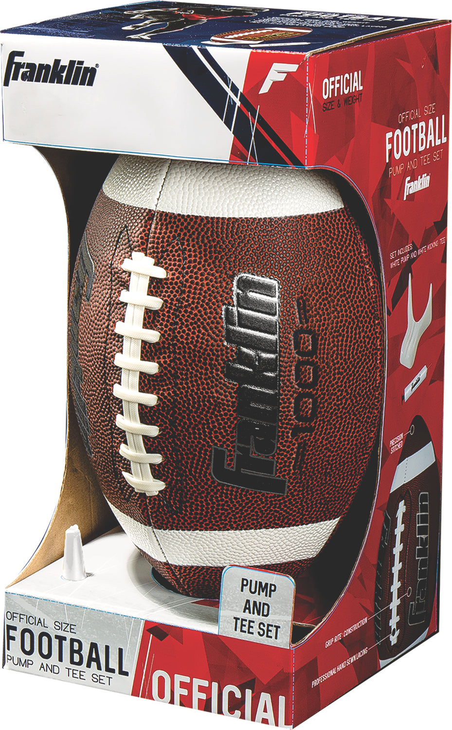 Our Franklin Sports Grip-Rite Pump and Tee Football Set features a deep pebble surface football with tacky touch cover, precision stitched and a gold colored pump and tee. Official size.