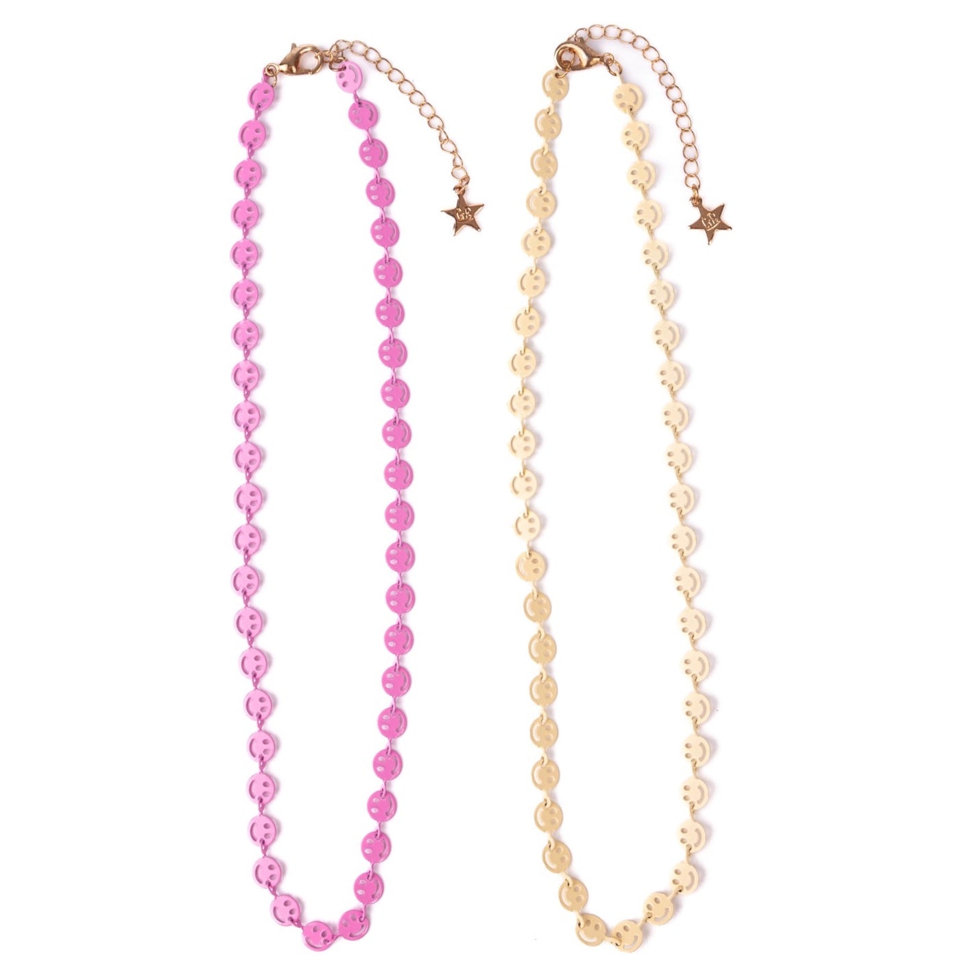 Add a burst of sunshine to their style with the Boutique Chic Pink Lemonade Necklace Set! This adorable set includes two chain necklaces, each featuring playful smiley face links. One necklace boasts cheerful pink smiley faces, while the other shines with bright yellow. A perfect duo for spreading smiles and sweetening any outfit!