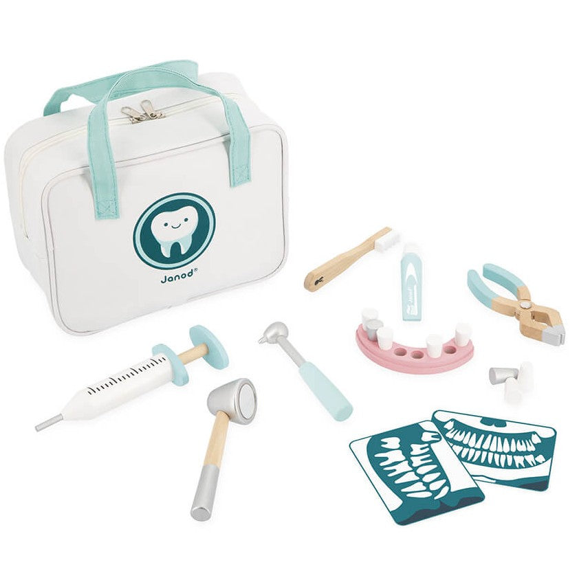 There's a hole in your tooth! We'll soon fix that! Bzzzzzz! This attractive 9-piece set includes a syringe, pliers, a toothbrush, toothpaste, a dental mirror, dentures with eight removable teeth, a dentist's drill and two cards showing jaw x-rays. It's perfect for any budding dentist! This great game is a fun way to teach your child about looking after their teeth! Water-based paint. Made of FSCTM-certified wood. Make-believe toy for children aged 3 and over.
