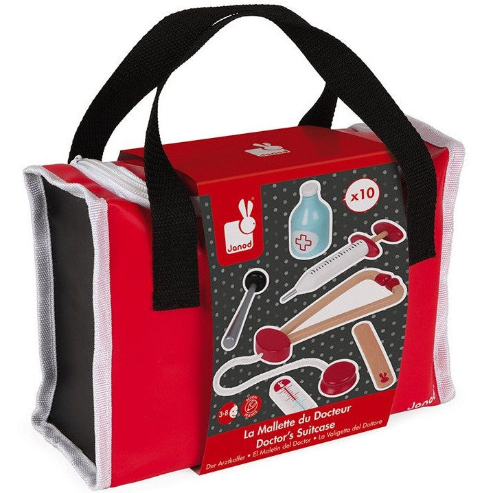 10 accessories: a syringe fitted with an inner spring, a reflex hammer, a bottle of disinfectant, a stethoscope, an otoscope equipped with a magnifying glass, a thermometer, a tongue depressor, a prescription pad (30 pages) with a paper pencil, a bandage roll. Accessories in solid wood. Suitcase in matt PVC. Delivered in a lovely red and black suitcase equipped with a metal zipper and 2 fabric handles. Silk-screen printing of the accessories. Inner cardboard wedge + hangtag fixed all around the suitcase with a polybag to protect the product during transportation.