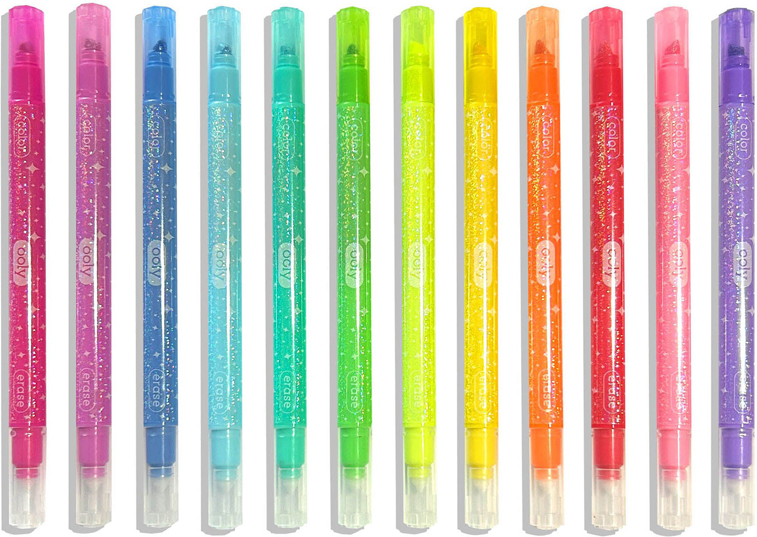 We're all for coloring outside the lines and creating your own sparkle - but if kiddos feel like they've made a mistake with these markers, they can easily erase it! This set of 12 glitter markers adds dazzling color to artwork, notes, journaling, and doodles, with sparkly ink on one end and a magic eraser tip on the other. Innovative artists also enjoy creating negative space inside colorful designs! Whether making bold strokes or delicate details, the sweet shimmer and easy erasing ensures your artist's creativity shines.
