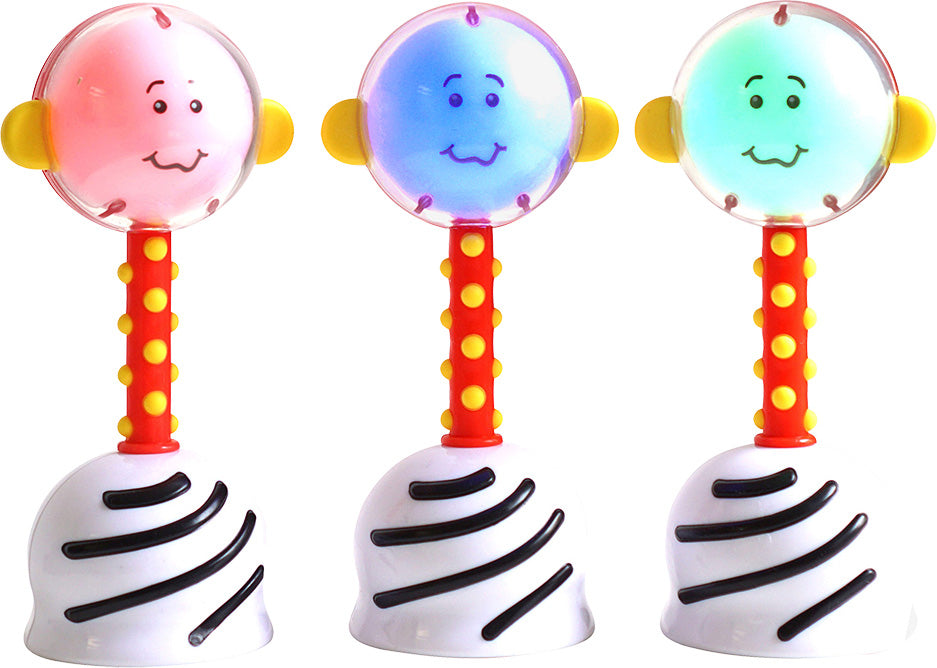 This developmental rattle is easy to hold, has a soft soothing sound plus three light-up colors that encourage visual tracking and attention. A colorful representation of a baby's whole new world! Includes 3 1.5V batteries.