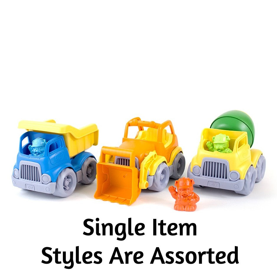Scoop it! Mix it! Dump it! Just another earth-moving, earth-saving day at the job site for the Green Toys™ Construction Trucks, made in the USA from 100% recycled plastic milk jugs that save energy and reduce greenhouse gas emission. Chunky, sturdy, and durable, the Scooper features a movable front loader for fill-and-spill fun. Perfect in a sand box, toy box, or gift box, this pint-sized truck is just right for little hands, and can easily be tossed in a diaper bag for on-the-go fun. The rest of the fleet (sold separately) includes the Mixer and the Dumper. Each vehicle comes with its own bulldog construction worker, and the figures are interchangeable among all three. Great for individual play, or sharing and swapping with friends.
