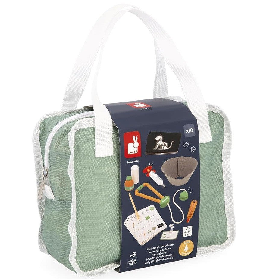 Rabbit, cat, dog? Always ready to care for your pet, with this comprehensive vet kit! 15 accessories: 1 badge, 4 prescription cards, 4 x-rays (rabbit, cat, fish and a broken bone), 1 bandage, 1 felt collar and 4 wooden accessories: stethoscope, syringe, thermometer and a pot of cream. Imitation toy made from FSCTM wood. Toy for children from the age of 3.