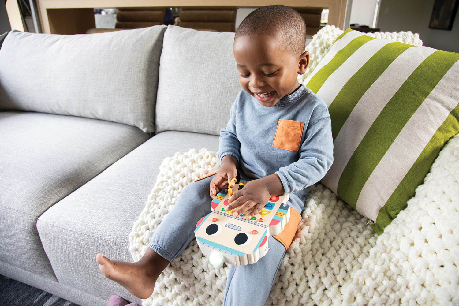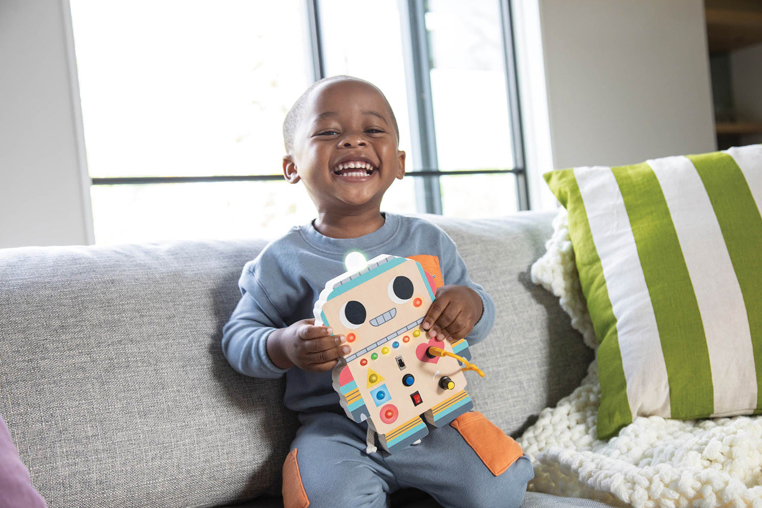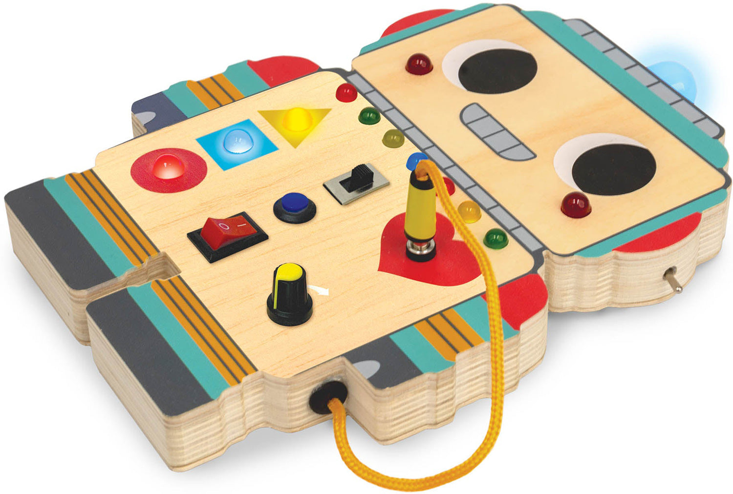Light up toddler playtime with a Montessori-inspired wooden switchboard robot! Blinkity Bot offers a rich playground for the development of fine motor skills, logical thinking, color recognition and hand-eye coordination, without overstimulating early learners. Enjoy engaging quiet time at home or on the go as they easily toggle the 7 switches and buttons to activate 13 vibrant lights and turn them off again - over and over! There's even a short cord to plug into Blinkity’s adorable red heart. Requires 2 AAA batteries, not included.