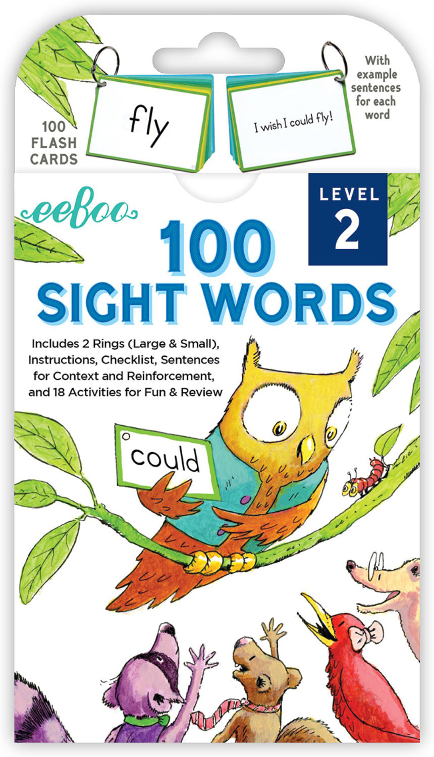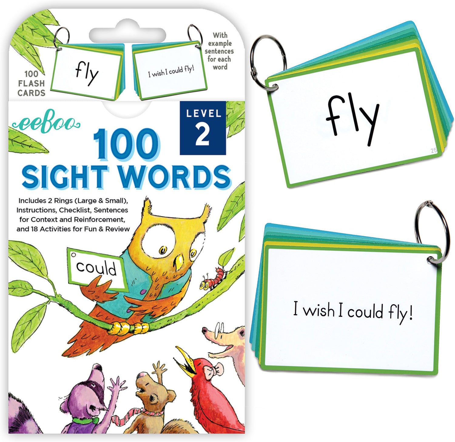 eeBoo's well-considered version of a fundamental educational tool. Sight word flash cards include 100 high frequency word flash cards, 18 learning activities, instructions, a checklist, and two rings to help children move through the deck of 100 cards by level. Level 2 includes high frequency simple words for children to learn through memorization, creating a foundation for literacy. Each flash card has the Sight Word on the front and a sentence to provide context on the back of the card.