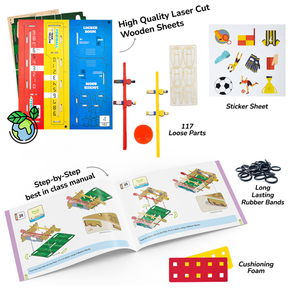 Check out our new favorite STEM activity for curious kiddos! Ages 6+ use the crystal clear instructions to build a durable foosball game from wooden pieces in about 90 minutes, no glue required. Once the 15" x 8" x 3.5" structure is built, kiddos can really play foosball with the two included balls! They'll learn about momentum, speed, and cause and effect as they experiment and compete to score goals.