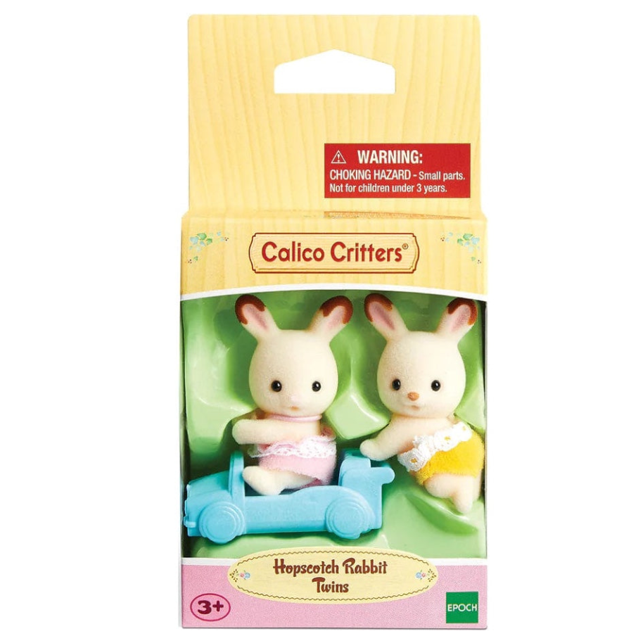 The Hopscotch Rabbit Twins set includes the Hopscotch Rabbit twins figures (one sitting and one crawling) and a ride-on toy. The figures can be posed by moving the head.