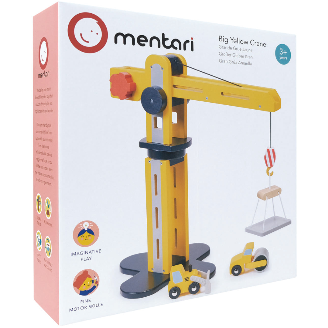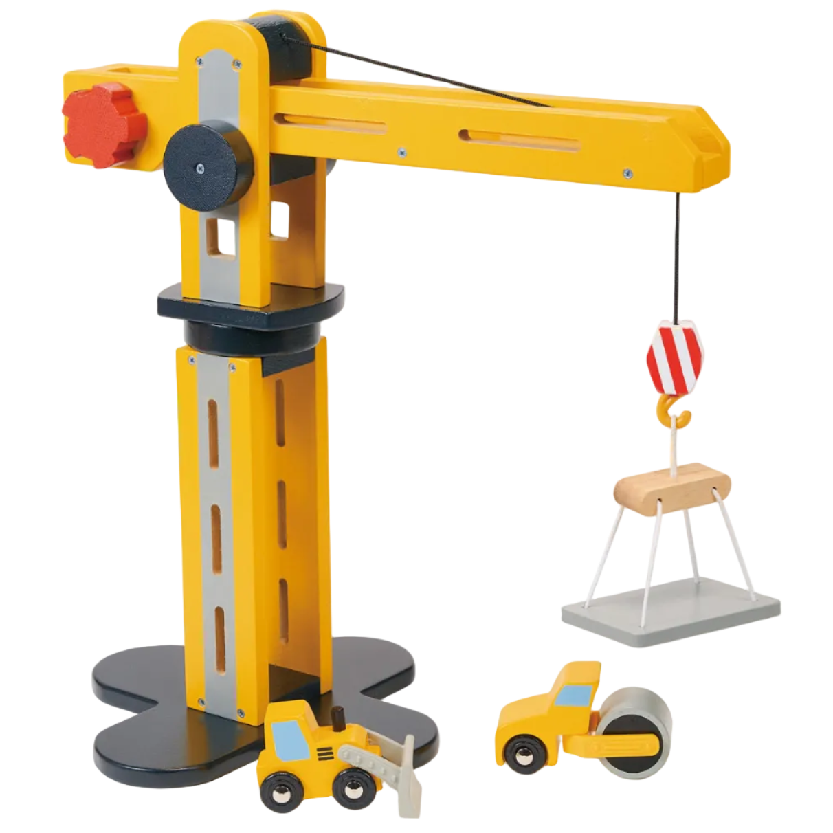 Enter the construction site and get ready to build years of imaginative adventures with this heirloom-quality wooden crane set! Future engineers use the dials to move the crane arm forward and backward and lift the hook up and down. Load the two included construction vehicles onto the platform and lift them into place on other household blocks or structures. Some assembly required.
