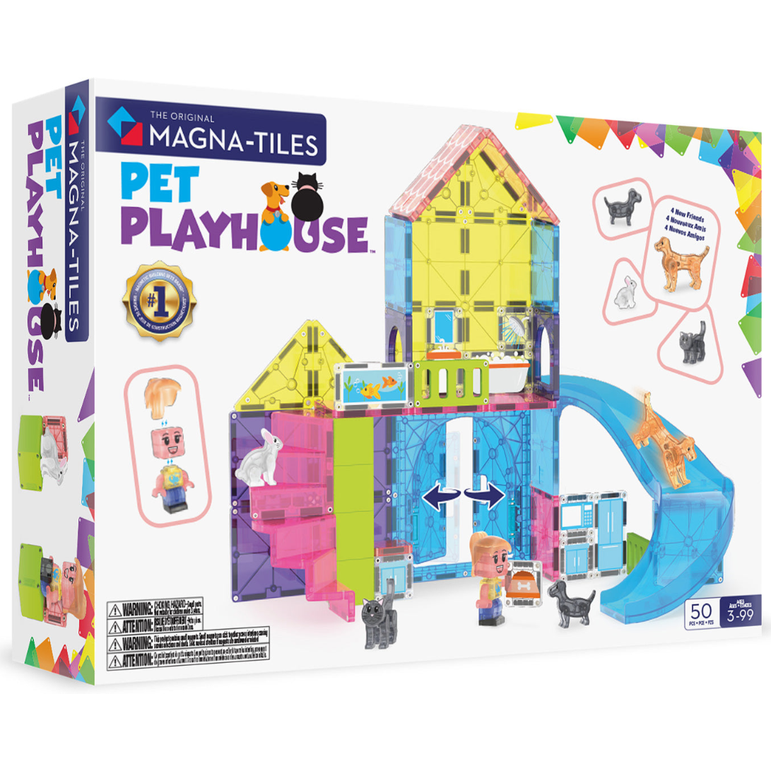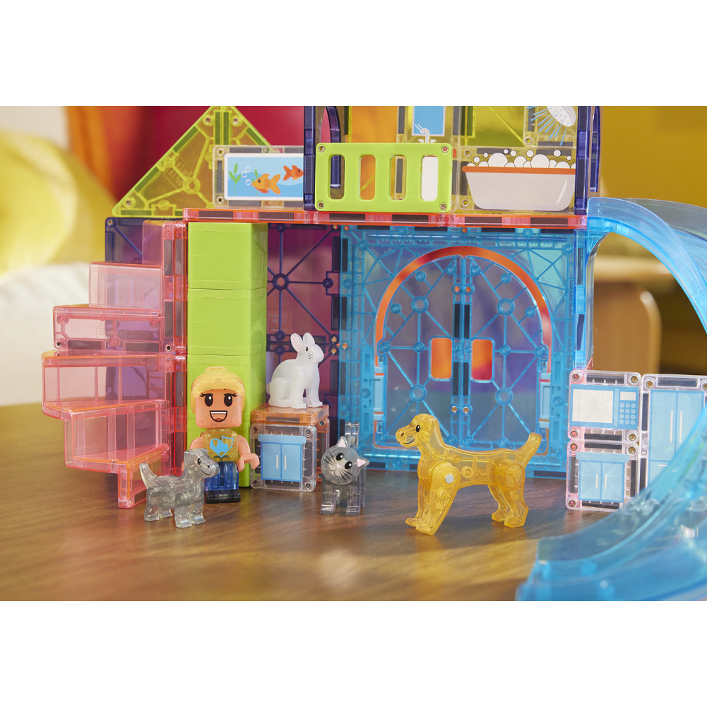 Step into a world where pets are here to play and creativity knows no bounds. With this 50-piece magnetic tile playset, kids build a pet paradise for a playful puppy, a curious cat, a bouncy bunny, and their adventurous dog friend. Open the Double Door to a playhouse where pets climb furniture, glide down the new slide piece, and explore a space filled with endless imaginative possibilities. Fun play elements include a Mix and Match Animal Caretaker, microMAGS Cubes, and fences and gates.