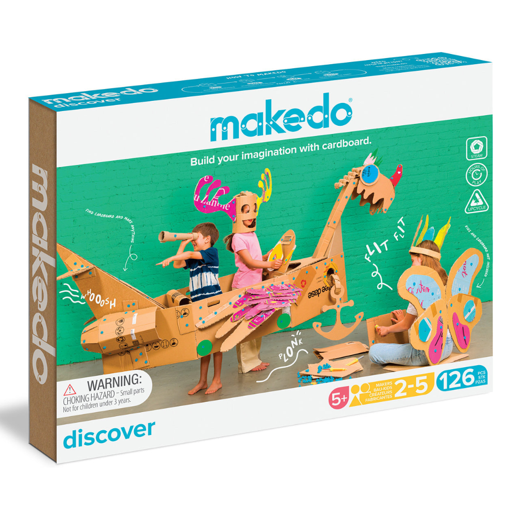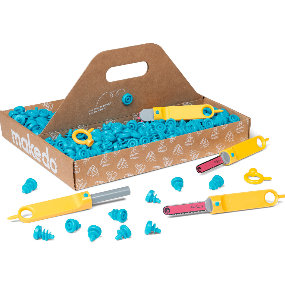 Grab some cardboard and unlock endless creativity with safe tools that help kiddos cut, fold, and connect imaginative structures! Makedo is a super fun, hands-on making experience that ignites open-ended, immersive play and brings friends and family together to create memories. These tools are durable and reusable for years of creative building. Turn cardboard into... a boat! A dinosaur head! A fort! A robot! A farm stand! When you visit our toy store, ask us for cardboard and if we have some, we'll grab it for you so you can create the designs of your wildest imaginations. Ideal for 2-5 makers, this 126-piece kit comes with 2 Safe-Saws, 1 Scru-Driver, 1 Fold-Roller, 90 Scrus (connect 2 pieces of cardboard), 30 Scru+'s (connect up to 5 pieces of cardboard), and 2 Mini-Tools in a cleverly designed cardboard tool tray.