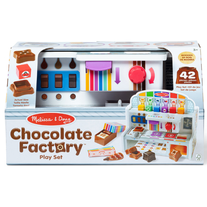 Sweeten up playtime for imaginative kiddos by putting them behind the counter of a chocolate factory! This interactive wooden playset features an intuitive design, empowering kids to order, assemble, display, and sell pretend play candies. They'll flip switches, slide a conveyer belt, drop wooden fillings and plastic coatings down chutes, and box up their creations! Complete with stickers and play money to elevate the fun, this set allows kiddos to mix and match 6 bases, 6 tops, and 6 fillings for countless creative combinations. Great for color matching, counting, and developing language skills through cooperative play.