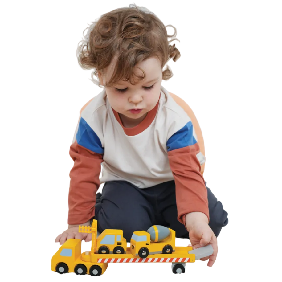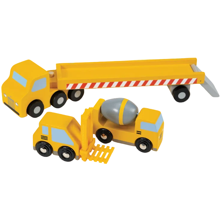 Enter the worksite and get ready to build years of imaginative adventures with this heirloom-quality wooden construction vehicle transporter! Hook the flatbed trailer onto the cab, lower the ramp, drive the cement mixer and forklift onboard, and roll off to the next building site! Combine with household block sets for more open-ended play adventures.