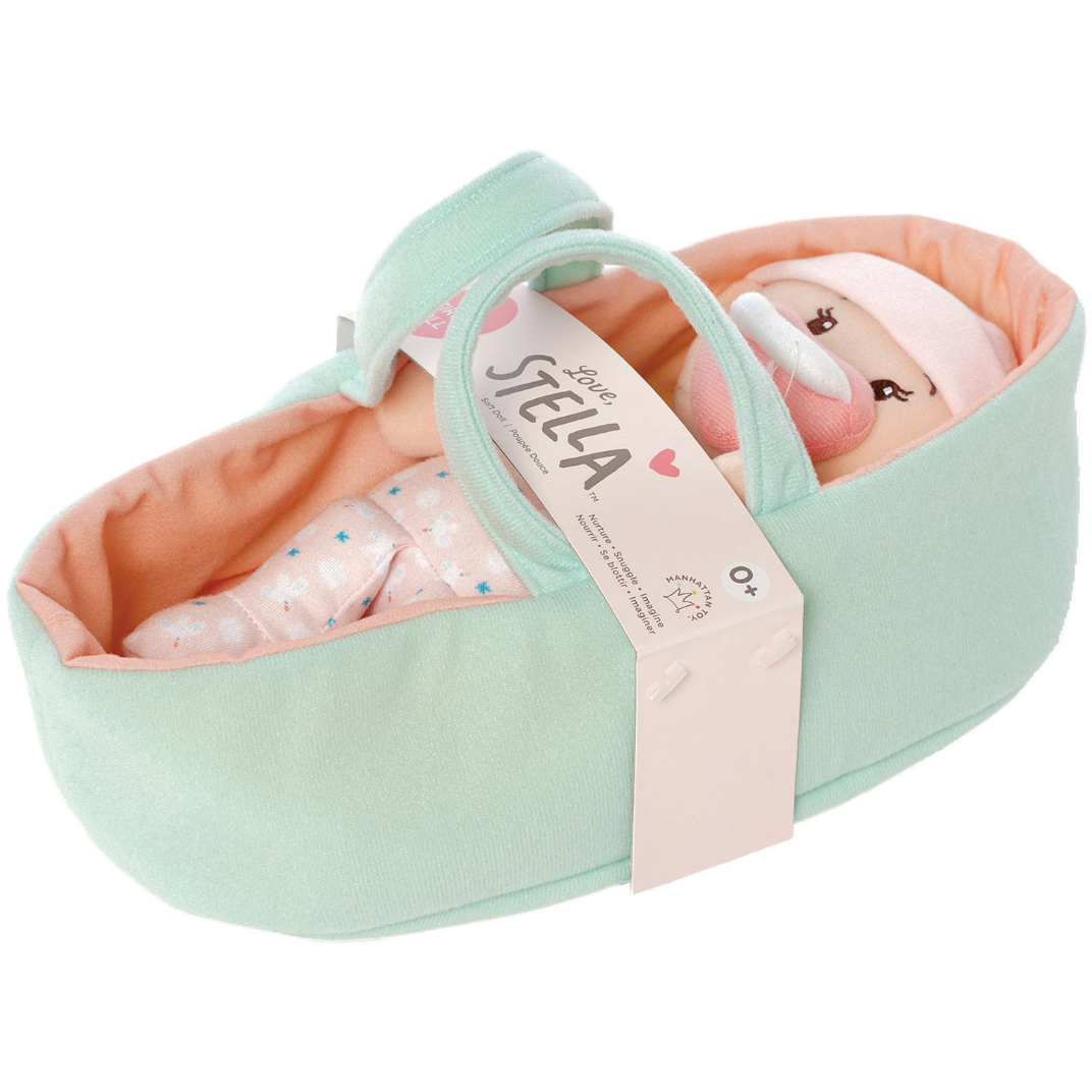 Encourage nurturing role play with this gorgeous peach soft doll and bassinet set. Early learners practice key social and emotional skills as they care for the 10" Baby Stella soft doll, help her sit up, attach the magnetic pacifier to her mouth, hug her in their arms and put her hat on, and put her to bed in the bassinet. Embroidered facial features help make Stella safe for infants, and she's machine washable in case she gets dirty!