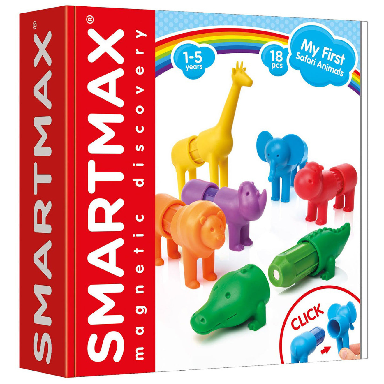 These brightly colored safari animals are a wonderful introduction to magnetic discovery for toddlers. The soft animal fronts and backs click easily onto the chunky center bars. Imaginative little builders can work on color matching skills to build a rhino, giraffe, elephant, hippo, lion and crocodile... or mix and match to create crazy new creatures! This 18 piece set makes 6 complete animals and is compatible with all other SMARTMAX.