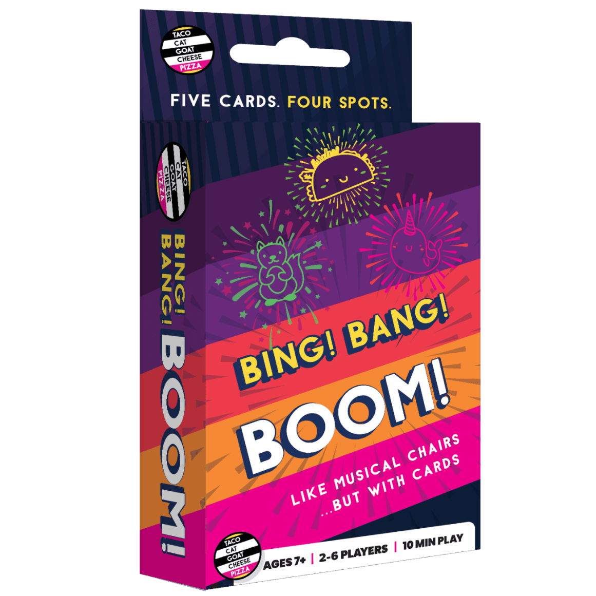 New from the creators of Taco Cat Goat Cheese Pizza: get ready for firework fun! It's a race against time as players scramble to launch their firework cards so they don't get stuck with the duds. The first player flips over the top card in their deck and plays it face up on the START launch pad, saying the card name out loud (taco, cat, goat, cheese, or pizza). All players look for cards in their deck that match that card. The first player to find a match plays their card on the BING! launch pad while saying "BING!" Players continue to frantically find and play other matches on the BANG! and BOOM! launch pads. One player will be left with a matching card in their hand - this is the Dud. The player with the fewest Duds at the end wins! A quick 10 minute gameplay makes this a go-to choice for group entertainment anywhere, anytime. For 2-6 players.