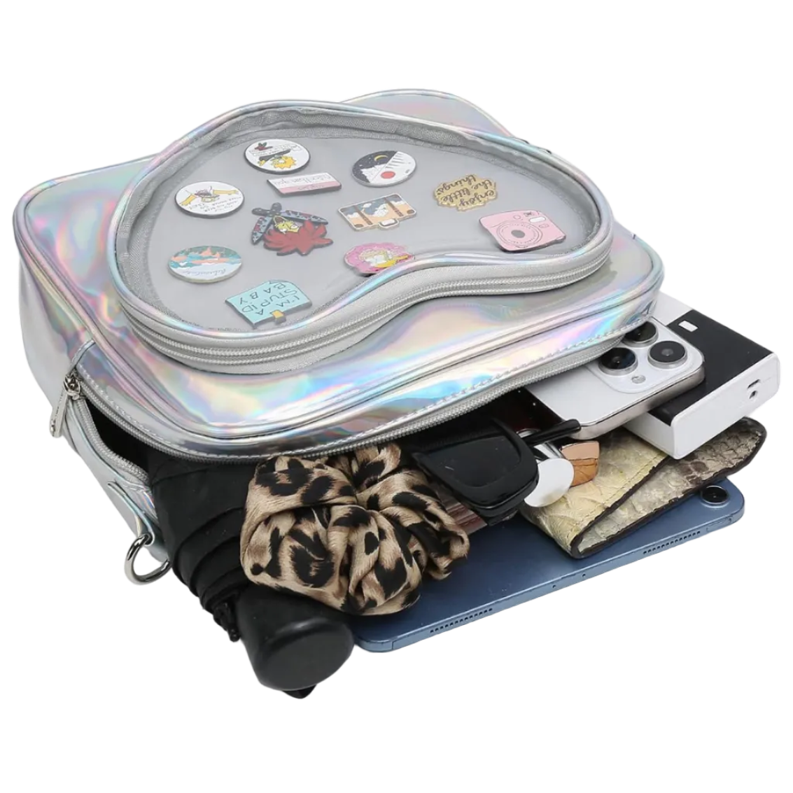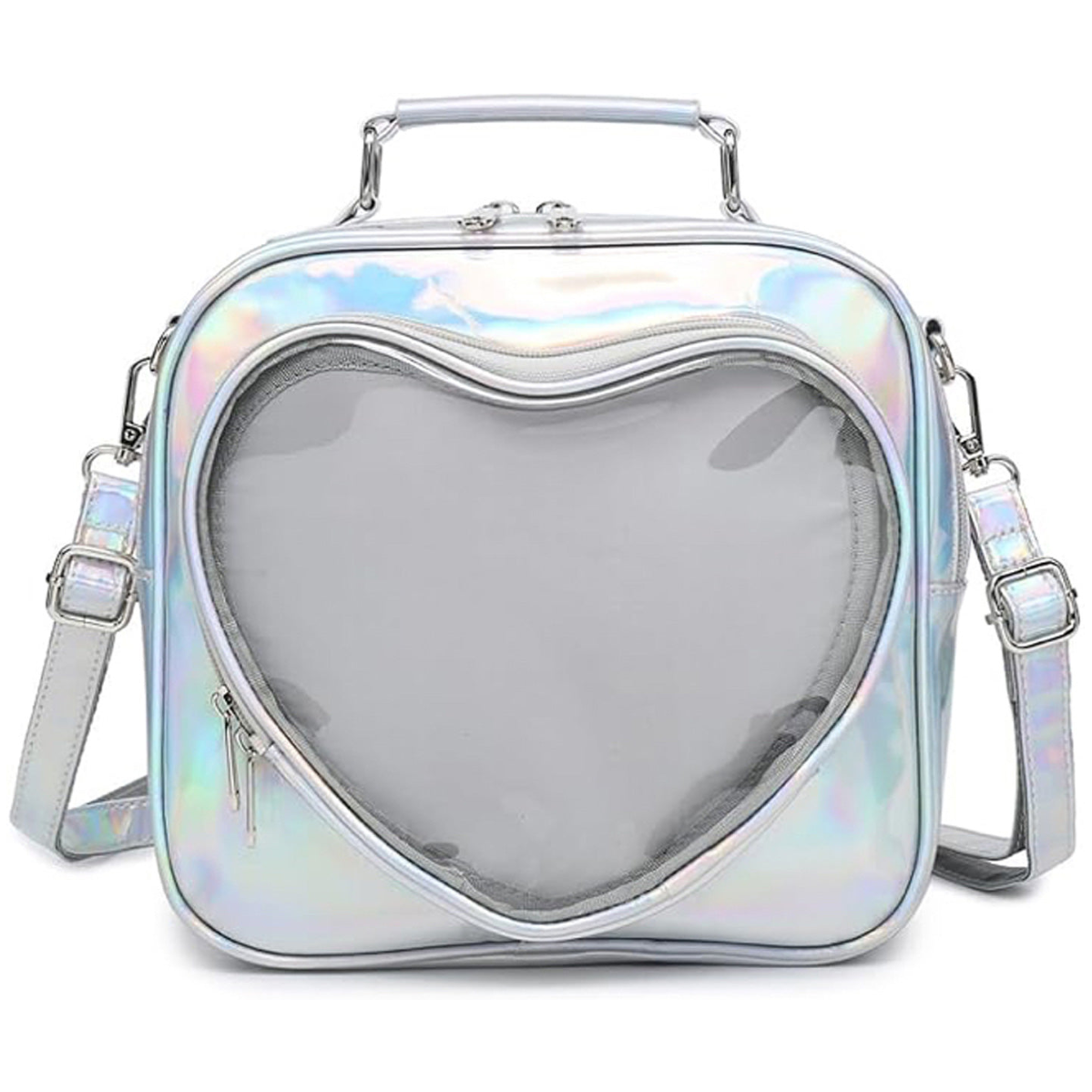 Fashionistas show off their style and their collectibles with this vibrant, holographic bag! Perfectly sized at 9.5" x 9" x 3", this zippered bag has adjustable straps so it can be worn as a backpack or crossbody style. The clear heart-shaped pocket in front can be filled with fidgets, miniatures, lip glosses, or other tiny treasures!