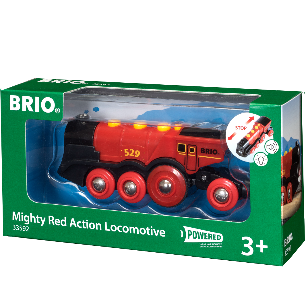With its two front lights fully lit, full speed ahead and the unmistakable "choo-choo" sound, the Mighty Red Action Locomotive impresses even the most experienced young train driver. This toy train goes both forward and reverse with accompanying light and sound effects, and the switch on top allows free wheel movement for play without battery function. This durable, retro designed toy allows your child's imagination to flow and helps improve their fine motor skills and spatial awareness.