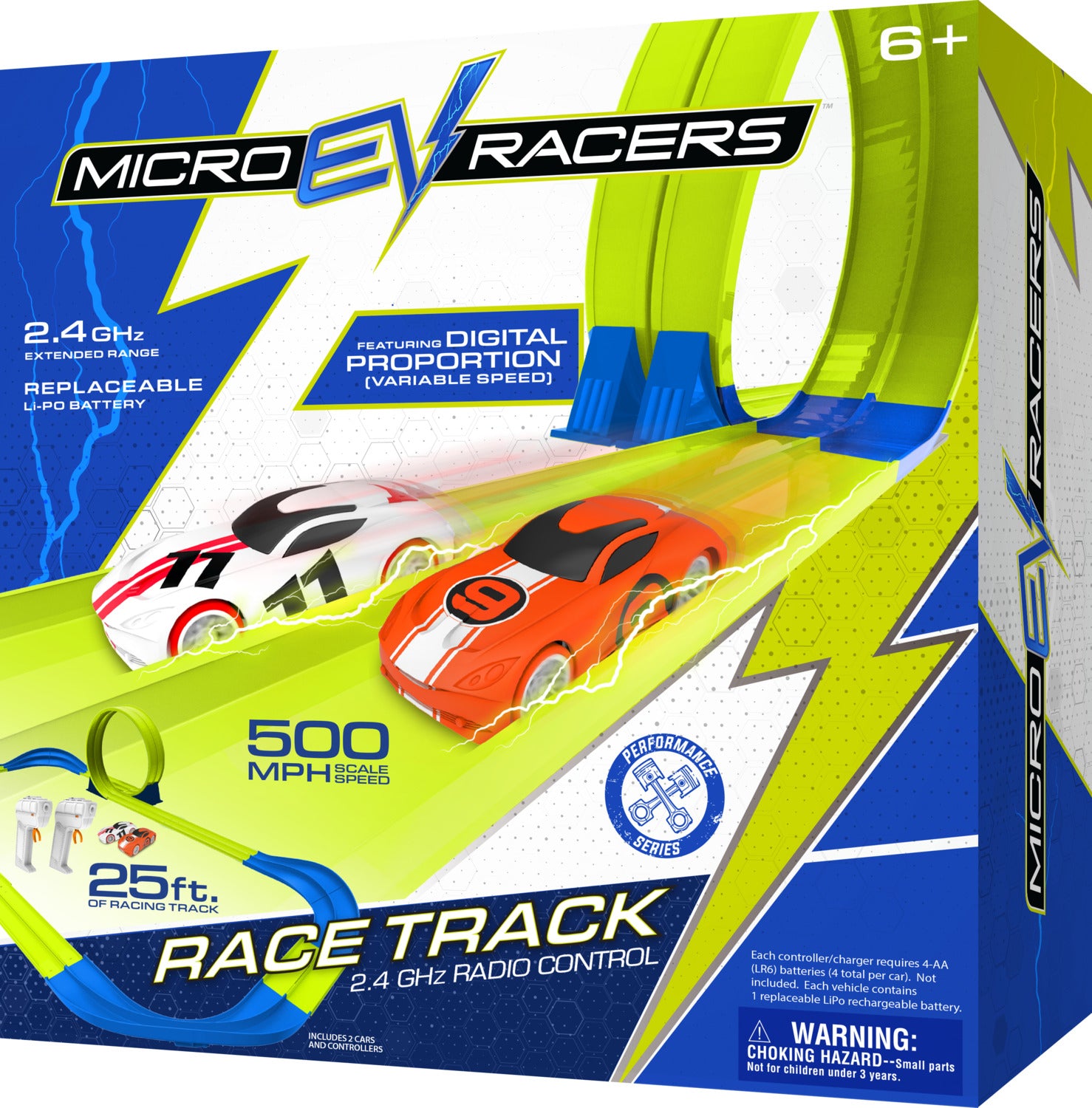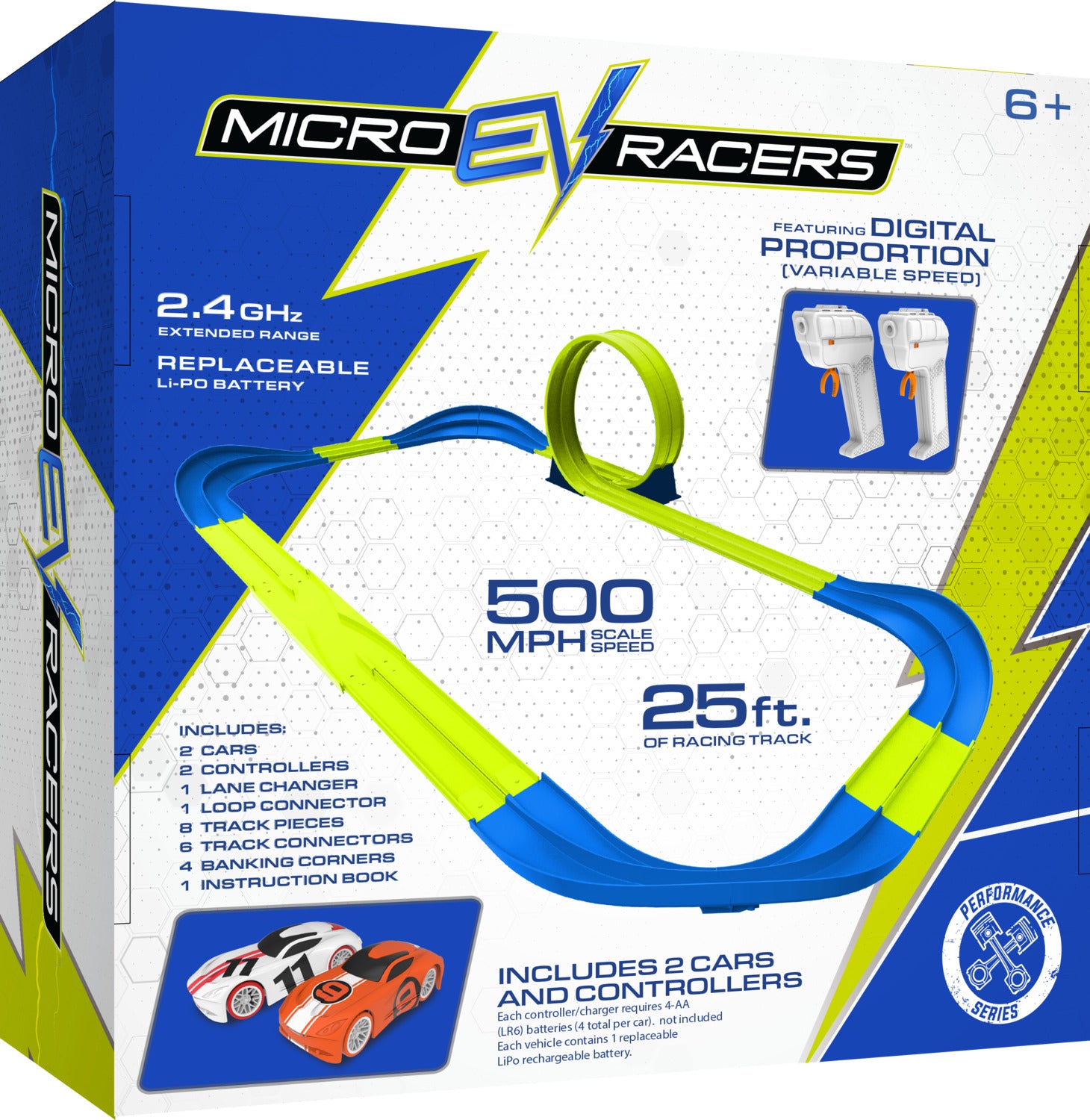 Micro EV Racers 2.4 GHz racing circuit provides the ultimate in high speed electronic racing. Suped up, variable speed racers zoom through a racing circuit made up of a 360 degree loop, 4 high speed, banked corners, and a crash zone lane changer. Each high speed racers include a replaceable, long lasting, lithium polymer battery.