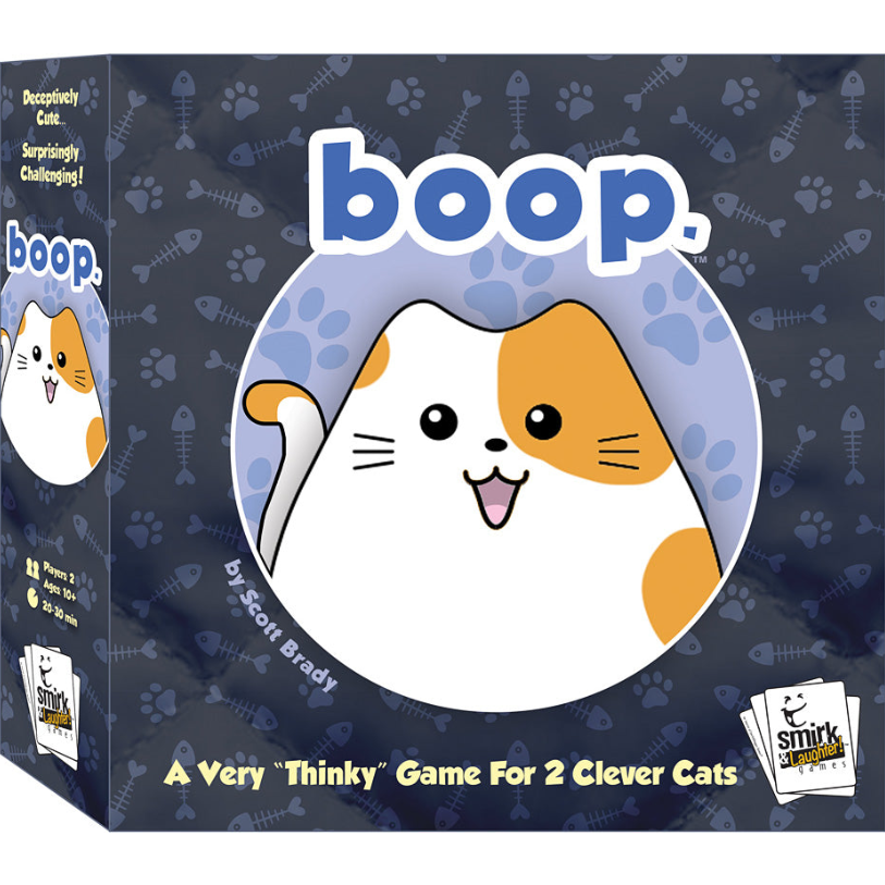 Deceptively cute, deceivingly challenging... boop is a purr-fect strategy game for two cat-loving players. When you place a kitten on the bed, it boops every other kitten on the board one space away. The goal is to line up three kittens in a row to graduate them into cats... and then get three cats in a row to win. But with both players constantly booping kittens around, can you master the strategy of herding cats? Plays in about 20-30 minutes. Includes a quilted fabric board, 16 wood kittens, 16 wood cats, and instructions. For 2 players.
