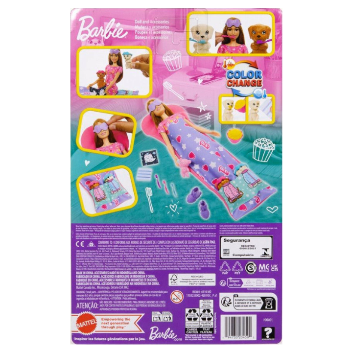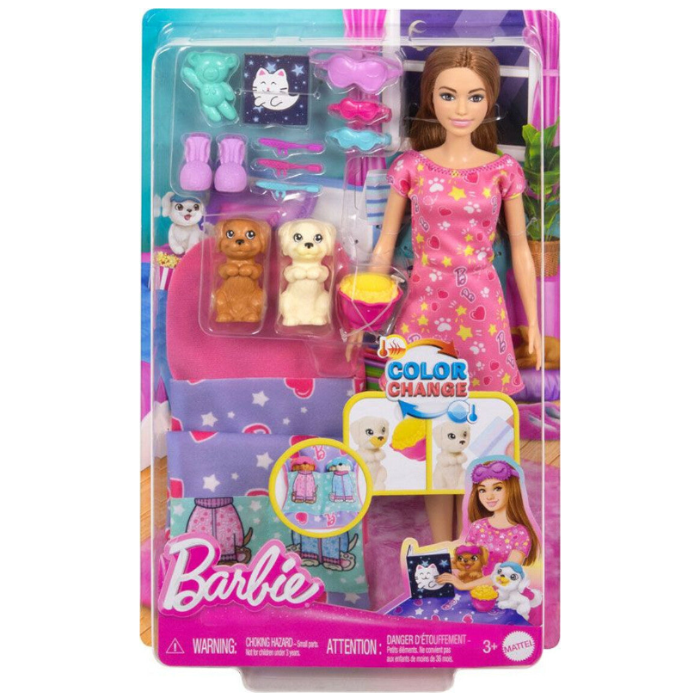 Barbie is ready to throw a puppy slumber party! This playset includes a Barbie doll, two adorable pups, a sleeping bag that fits all three, and 10 accessories. For color-change fun, kids can transform the puppy's face from clean to buttery using icy cold and warm water. Ready for a fun night in, Barbie doll wears a nightgown and slippers. Everyone has an eye mask for sweet sleepover dreams!