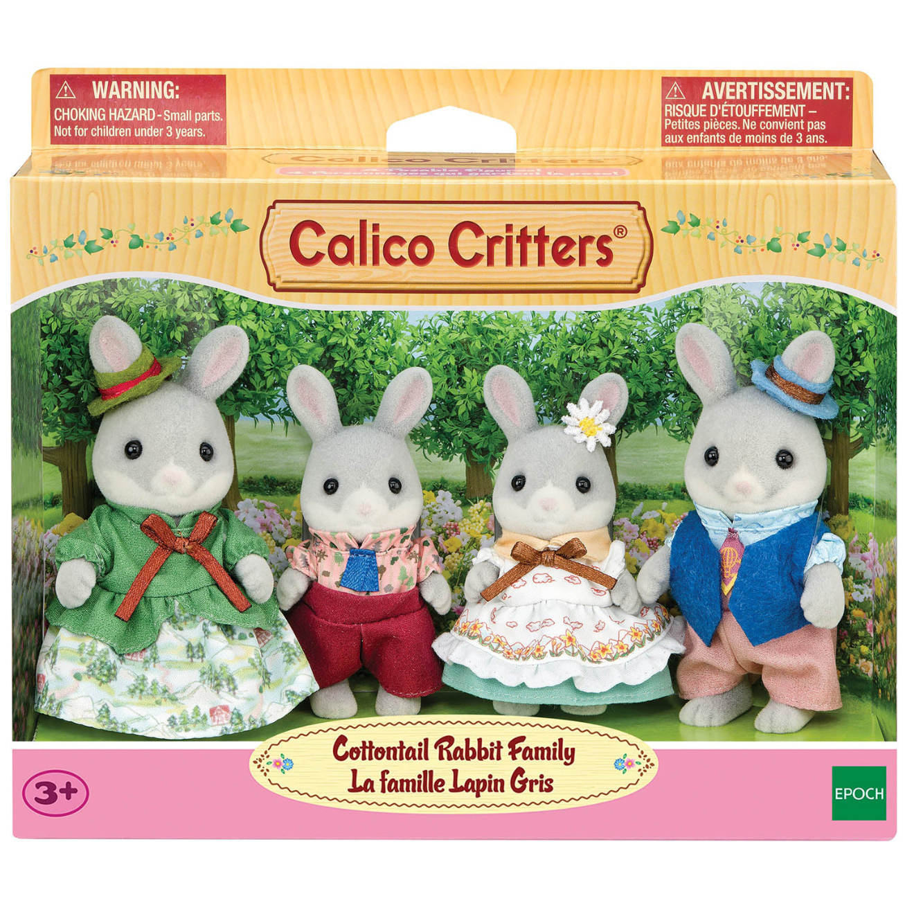 Imaginations soar in the pretend play world of Calico Critters. Get started or expand your collection with four soft, poseable gray and white rabbits in removable clothing. Meet the Cottontail Rabbit family: father Aaron, mother Sorrel, girl Willow, and boy Gromwell, all dressed in their best outfits with bows, hats, and vests! Calico Critters spark storytelling adventures for young learners, and are highly collectible for older kids.