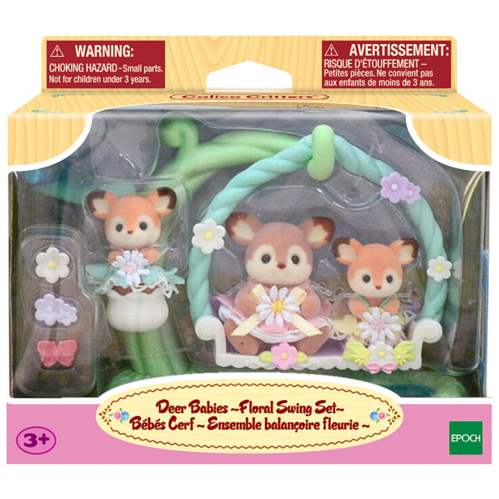 Imaginations bloom in the whimsical world of Calico Critters with this enchanting ready-to-play set. Little learners will love creating endless storytelling adventures with this beautifully detailed floral swing set, featuring three adorable deer babies. Every detail is irresistibly sweet: heart-shaped noses, removable floral dresses and hair accessories, a functional ivy swing, a lily of the valley cradle, and shimmering water ripples beneath the swing. The deer babies each have unique colors and ear patterns—the cradled twins are caramel-colored, while the standing baby is cocoa-colored with delicate petal-patterned ears. The babies can sway in the ivy swing, nestle in the lily of the valley cradle, or perch on the leaf with its glistening water droplet. Plus, flower and butterfly ear decorations add an extra touch of charm! This set is perfect for imaginative play and makes a delightful addition to any Calico Critters collection!