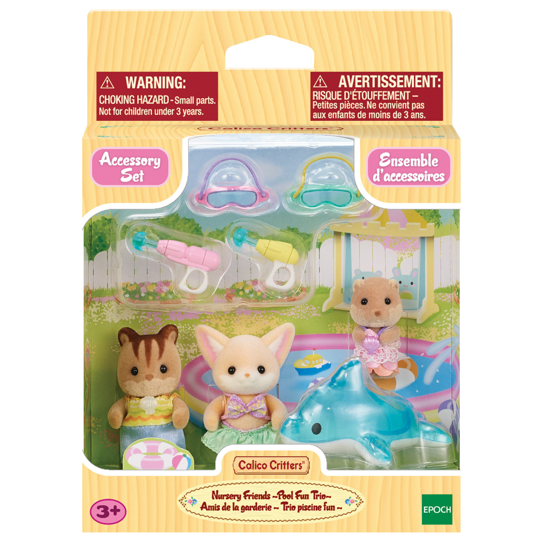 Imaginations soar in the pretend play world of Calico Critters. Get started or expand your collection with this set of three soft, flocked babies in removable swimming outfits. They are ready for a summer day of pretend play in the pool! This set includes Fennec Fox baby Yulie, Walnut Squirrel baby Ambrose, and Splashy Otter cradled baby Nicola, along with 2 pairs of goggles they can wear, 2 pool toys they can hold, and a dolphin pool float that cradled babies can ride on. Some critters and accessories sold separately.