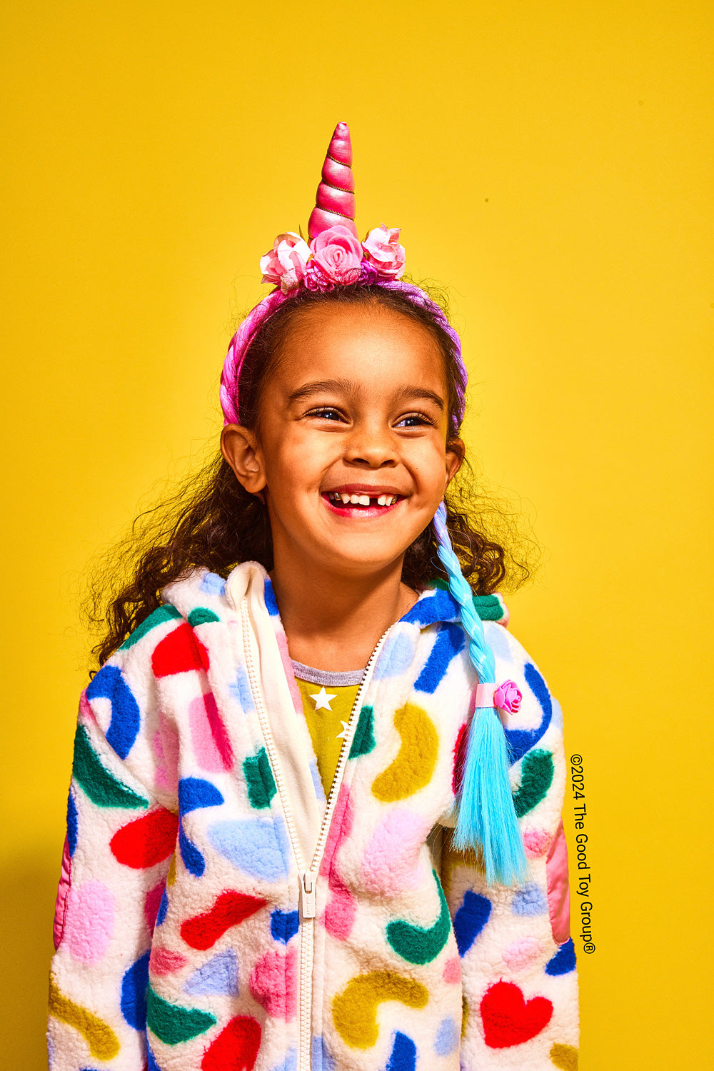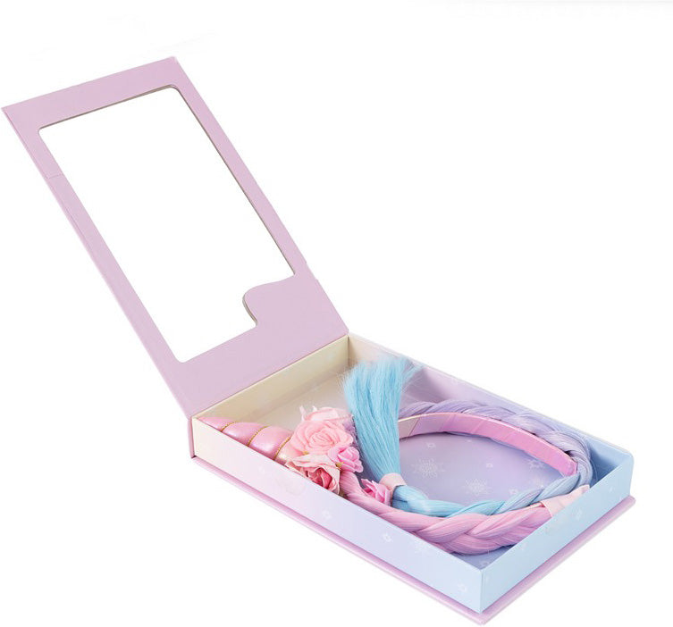 If your imaginative child loves to play pretend as a unicorn, then they need this unicorn princess hair braid! It harnesses the magic of this mythical creature with a long ombre braid that fades from pink to purple to blue. The pink iridescent horn sparkles with a gold accent and pretty pastel flowers complete the look. Perfect for twirling, prancing, and leaping, it's beautifully crafted yet built for years of imaginative play adventures.