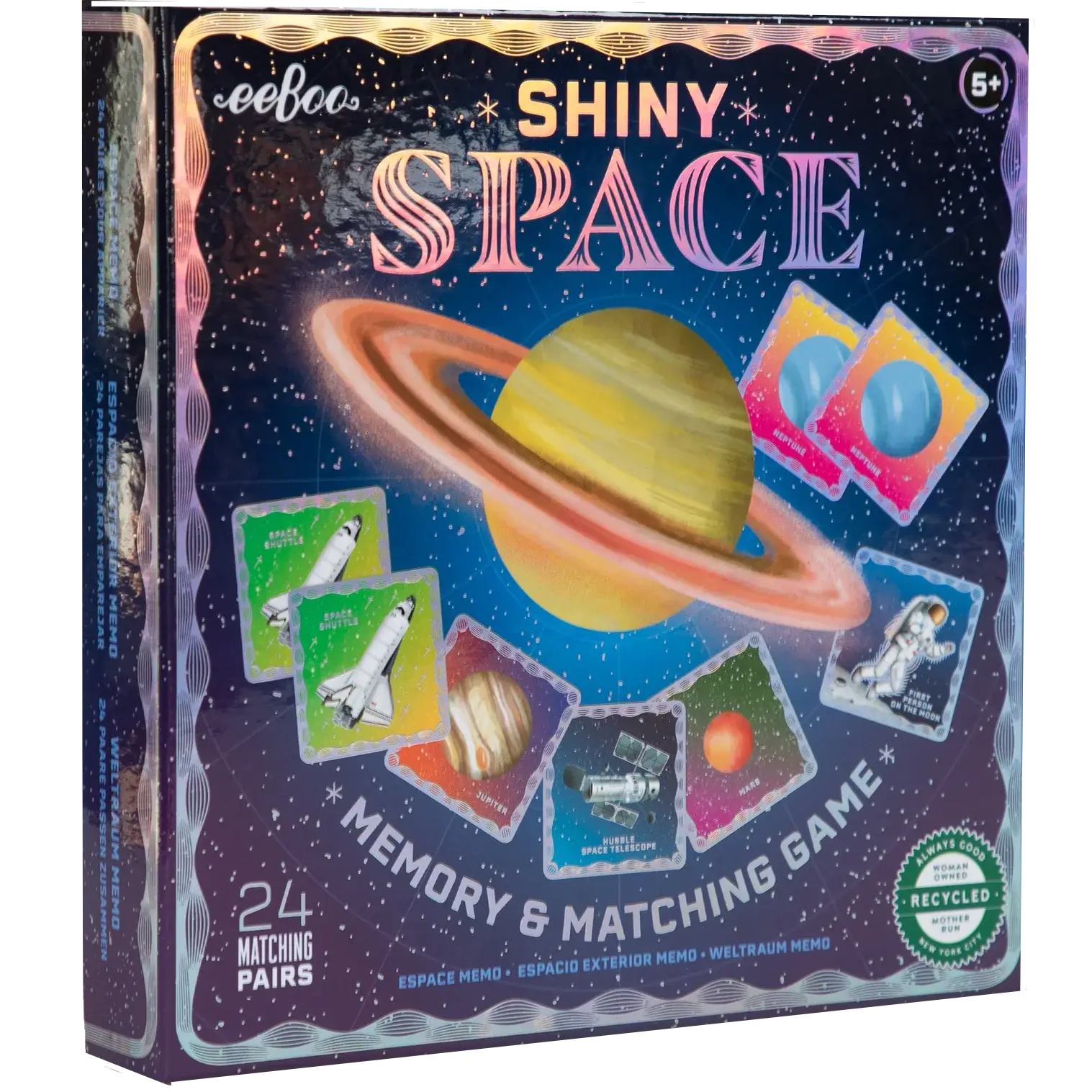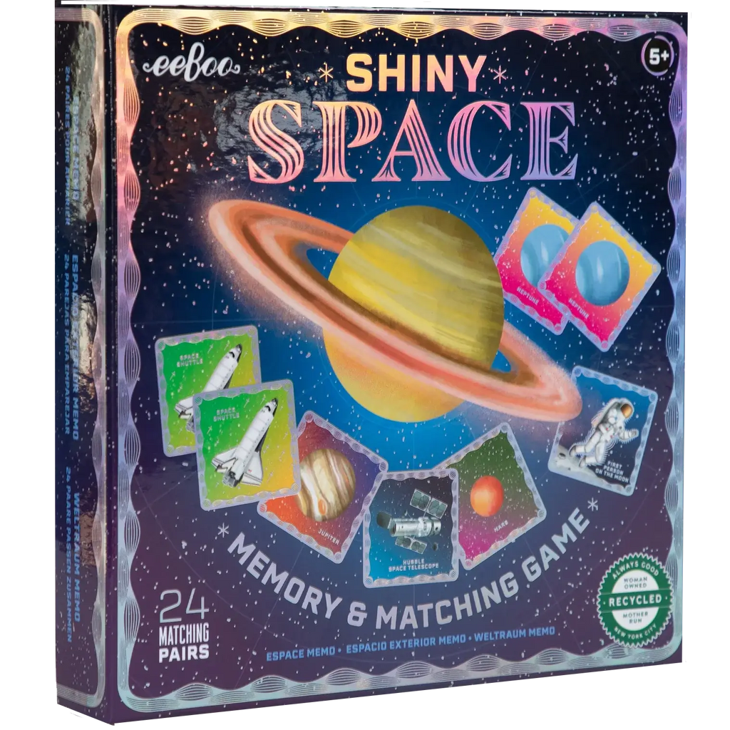 Get ready for an out-of-this-world experience with the Eeboo Space Shiny Matching Game! This fun matching game will have you searching for pairs of shiny space objects as you learn about the wonders of the universe. Blast off into excitement and challenge your memory skills with this intergalactic game.