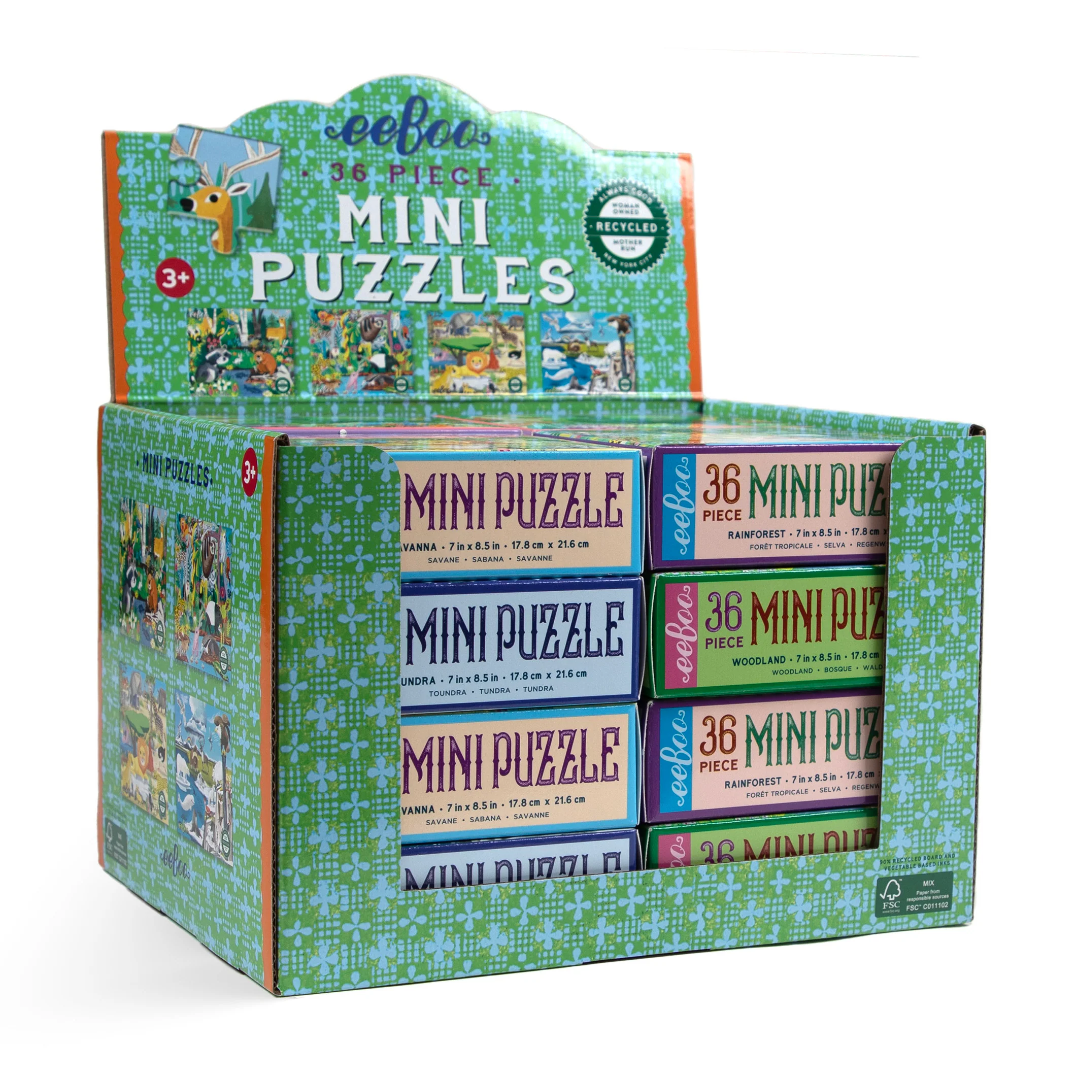 4 mini puzzles illustrating Rainforest, Savanna, Tundra, and Woodland and many of the creatures that call them home, featuring the artwork of Linda Bleck. Explore different animal habitats with eeBoo's Mini 36-Piece Wild Habitats Puzzle Assortment.