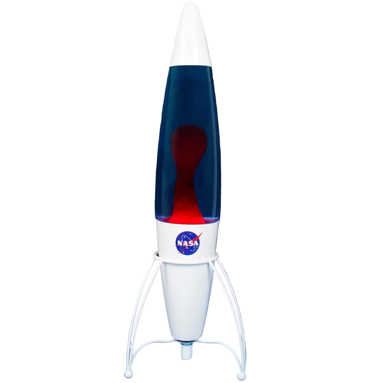 Dock this rocket lamp in your space loving kiddo's bedroom and inspire them to dream of life among the stars! This unique lamp features mesmerizing lava-like blobs that float and dance inside a sleek, rocket-inspired glass vessel with the NASA logo. This soothing lamp measures 16.9" tall. Power cord included and plugs into any main outlet.