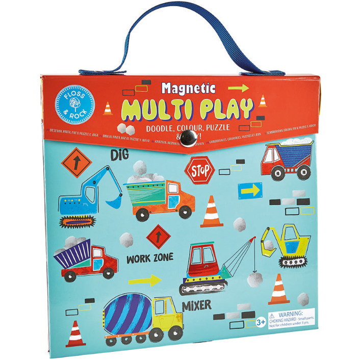 Travel entertainment at its best: doodle, color, puzzle, and play, all in one fold-out kit! The magnetic construction play scene opens up to reveal a 20 piece tractor puzzle, 4 color dry wipe pens with erasers, pop out work zone play pieces, and a dry erase doodle and color section. Everything is magnetic, so no chance of losing pieces during bumpy road trips or rough air. The high quality fabric handle, snap closure, and clever 9" x 9" x 1" design make this a top pick for summer adventures.