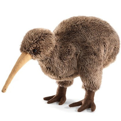 The Kiwi from down under in New Zealand is a pear shaped and nocturnal flightless bird. This endangered species shares its name with natives of its homeland and is dear to those who wish to protect and preserve their environment. A plush puppet with velour accents, animate the head and foot pockets for lifelike movement.