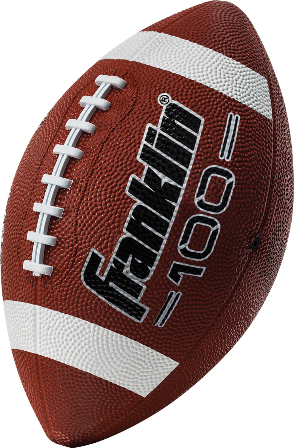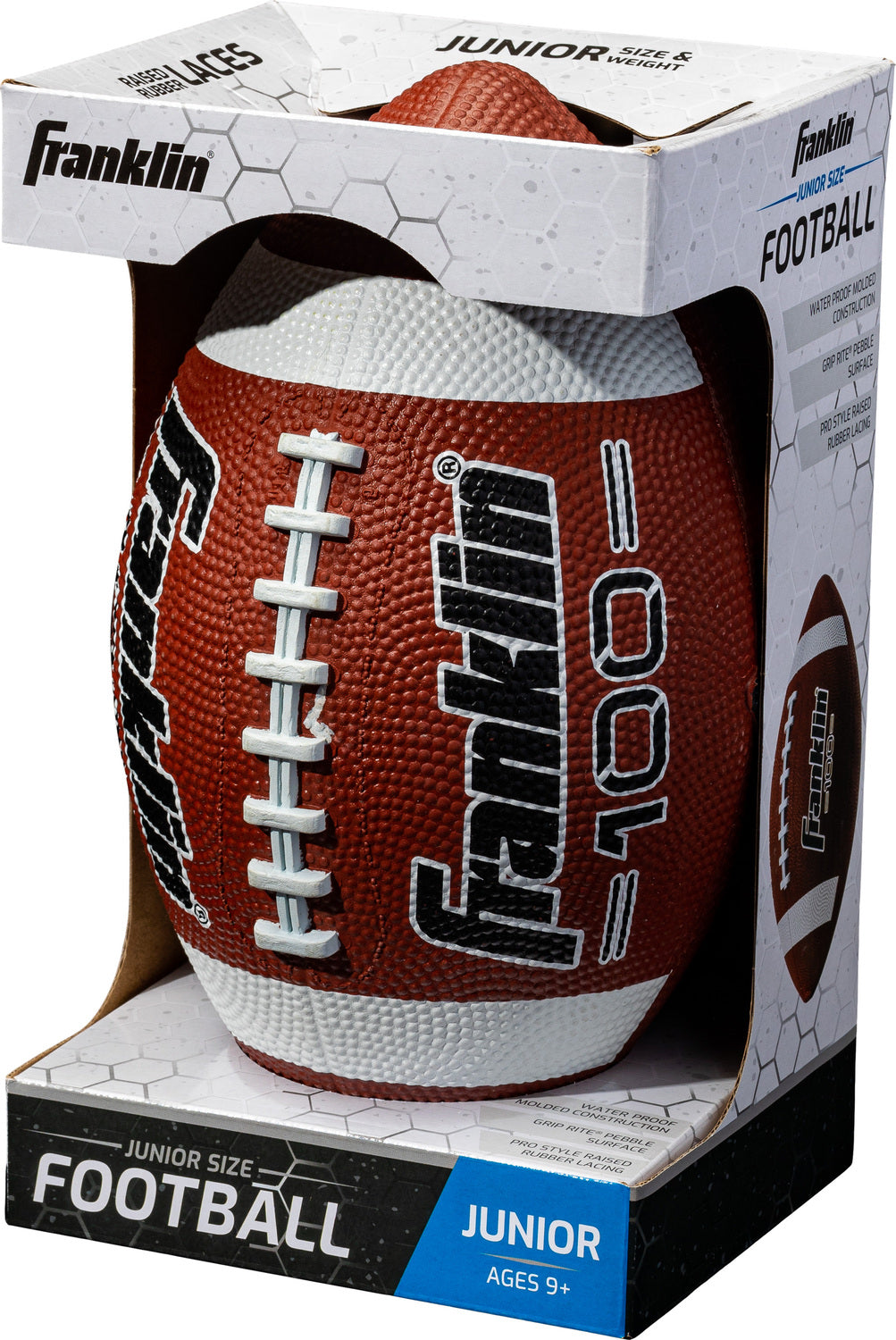 Franklin Sports' Grip Rite 100 Junior Footballs are the perfect footballs for kids to toss around in the playground, at the park, on the beach or anywhere else the game takes them! These junior sized footballs are designed for younger players to be able to throw and catch with ease. The dimensions are official junior size 10" long by 6" wide which make these footballs perfect for kids. The deep-pebbled rubber surface makes these footballs easy to grip for better throws and catches. Plus, the pro style raised laces make it easy for smaller hands to control and toss the ball for accurate spirals. The ultra-durable rubber construction ensures that you can use this ball on grass, sand or concrete without having to worry about tearing or damage. These footballs are available for individual purchase or in team packs of (6) that come with an inflation pump included. So grab your Grip Rite 100 Junior Football and get the game started today!