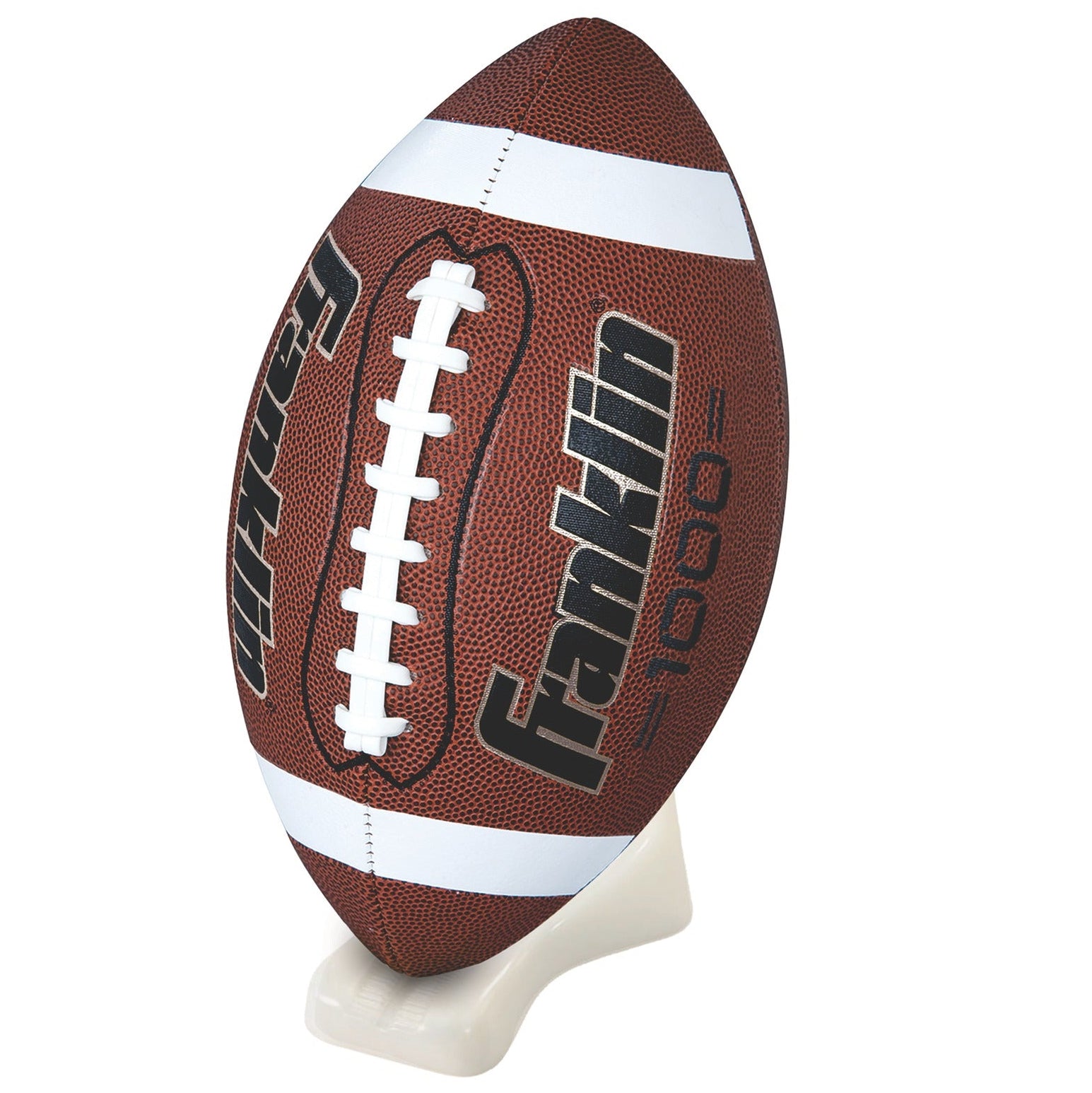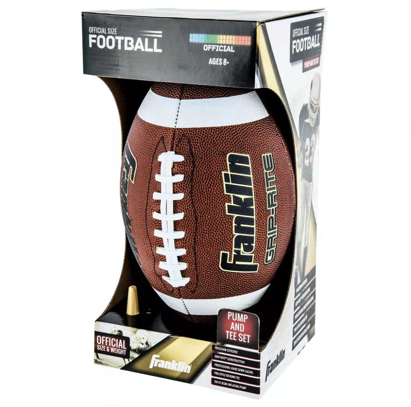Our Franklin Sports Grip-Rite Pump and Tee Football Set features a deep pebble surface football with tacky touch cover, precision stitched and a gold colored pump and tee. Official size.