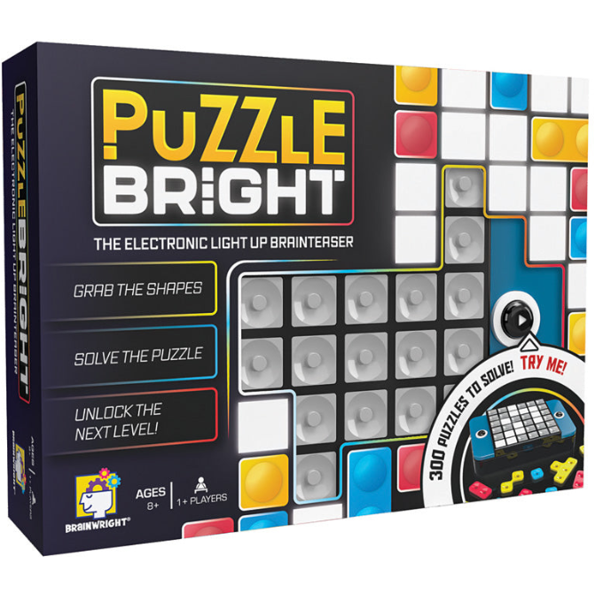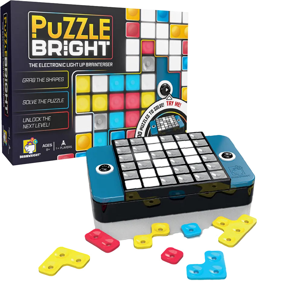Get ready to light up your brain with Puzzle Bright, the ultimate digital tactile puzzle game for kids and adults who love brainteasers! With over 300 exciting challenges, this travel-sized game keeps your mind sharp and your hands engaged. The goal? Fit the colorful Tetris-style pieces onto the electronic light-up grid! Choose your difficulty level—from easy to hard—and let the colorful glowing lights guide your way. Your challenge is to figure out how to cover the white lights on the board without having any same-color pieces touching! cover all the white lights on the board without placing two same-colored pieces next to each other. But be warned—there's only one correct solution for each puzzle! Need help? Use can get up to two hints per puzzle to keep going. Perfect for at-home fun or on-the-go entertainment, this compact game neatly stores all pieces inside, making it a great travel companion. For 1 or more players. Requires 3 AAA batteries, included.