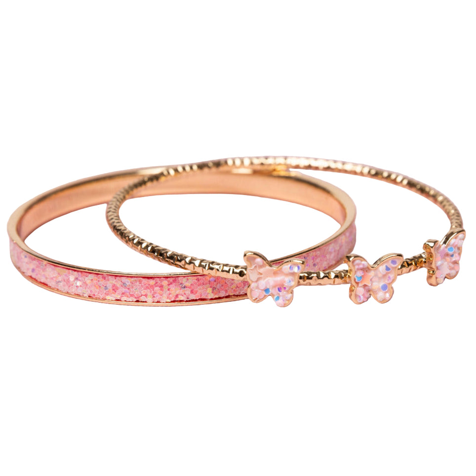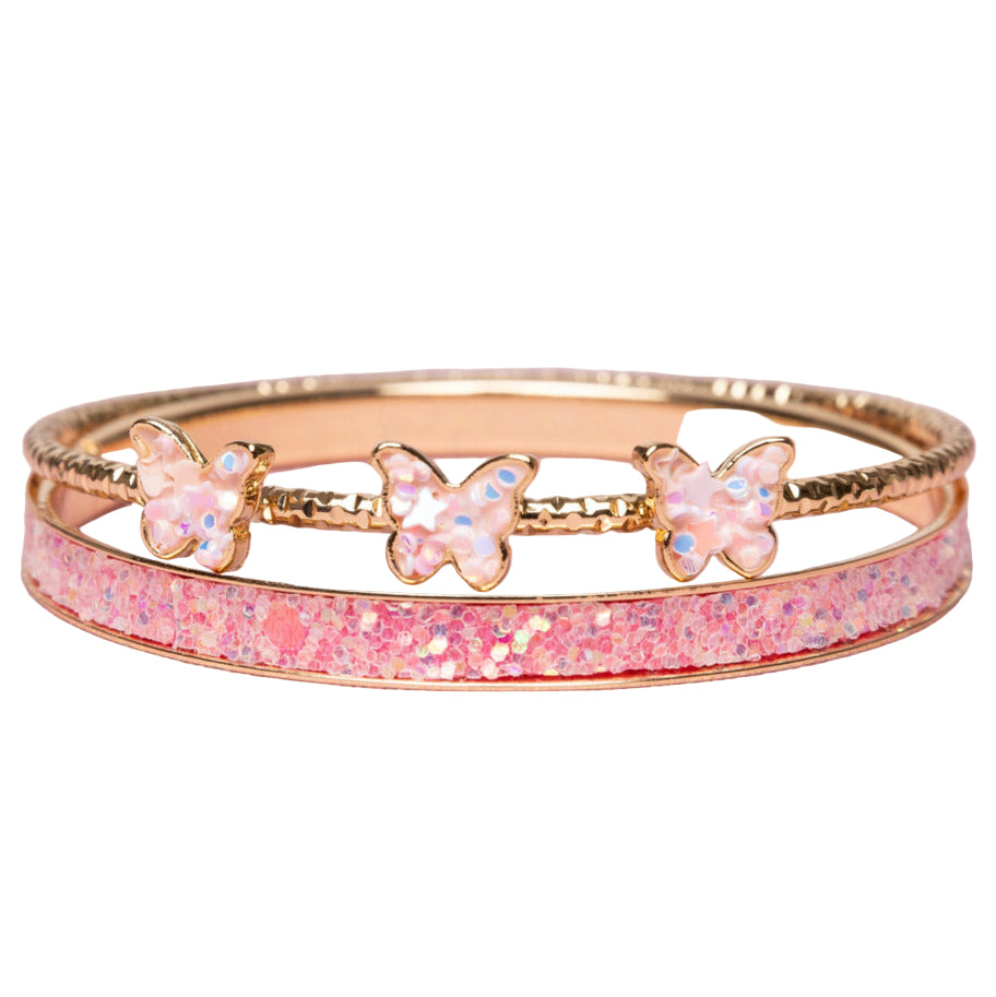 Elevate your style with Great Pretenders' Boutique Chic Butterfly Bangles, featuring a stunning combination of a beautiful pink glittery bracelet and a delicate thin gold bracelet adorned with three charming pink butterflies.