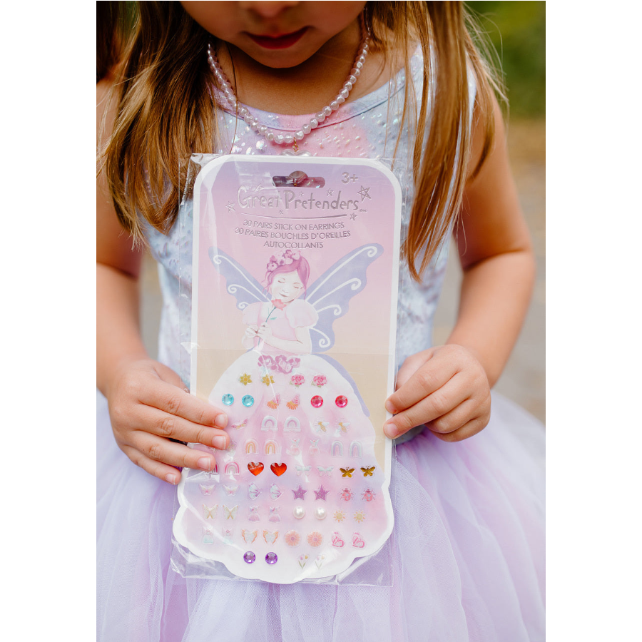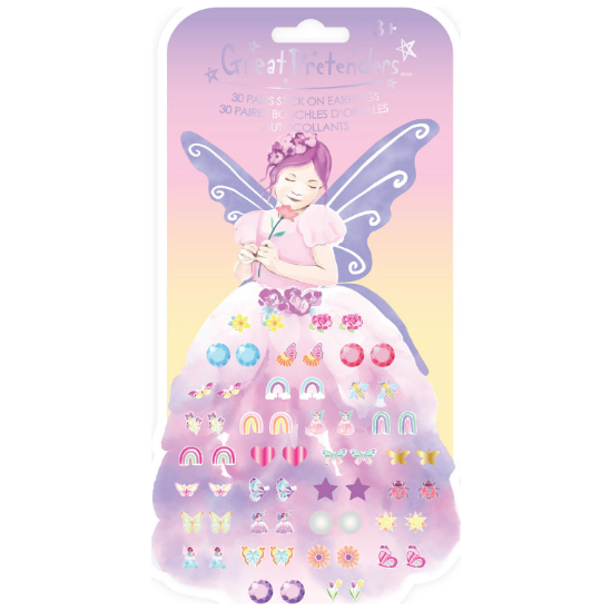 Sweet as can be, Great Pretenders Butterfly Fairy Triana Sticker Earrings are as magical as you can imagine. This set of 30 earrings comes with a collection of beautiful fairies, butterflies, rhinestones, pearls, and many more custom designs! This set makes the perfect gift for the little one in your life.
