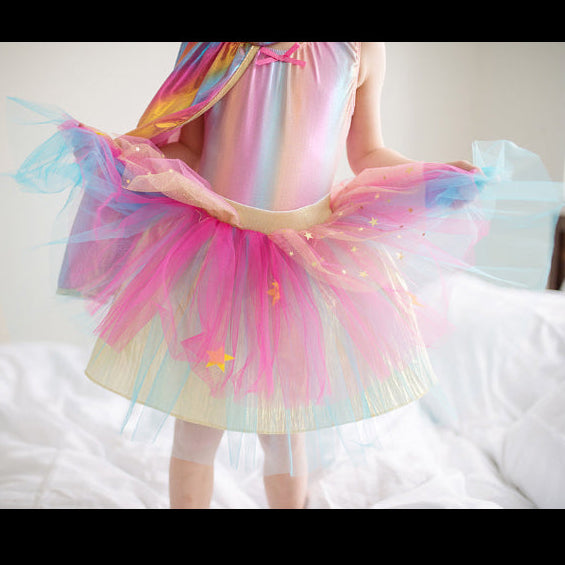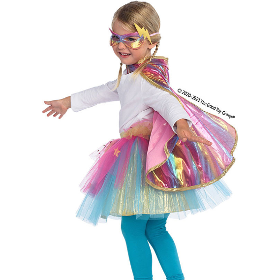Transform with this beautiful rainbow trio to unleash the superpowers from within! Set includes pink mask with yellow lightning bolt, rainbow-colored cape with gold trim, and pink-blue-and-green tulle skirt with gold elastic waistband over a solid underskirt, all designed to give your little one glamor and confidence.