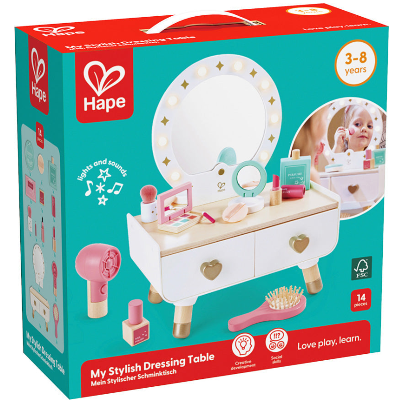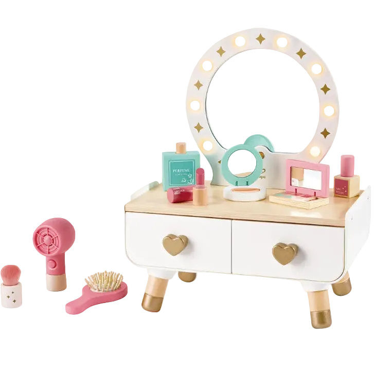 Give a memorable gift that fosters creativity as children immerse themselves in pretend play makeup artistry. There are so many ways for ages 3-8 to play with this compact, desktop wooden vanity: turn on the mirror lights to illuminate smiles and pull the wooden accessories out of the drawers. Kids can comb their hair, pretend to apply makeup and perfume, and press the button on the hair dryer to hear it whirr. Encourage self-discovery through exploration of self-care routines, building confidence and self-awareness. Requires 3 AAA batteries, not included, for mirror lights and 2 cell batteries, included, for hair dryer.
