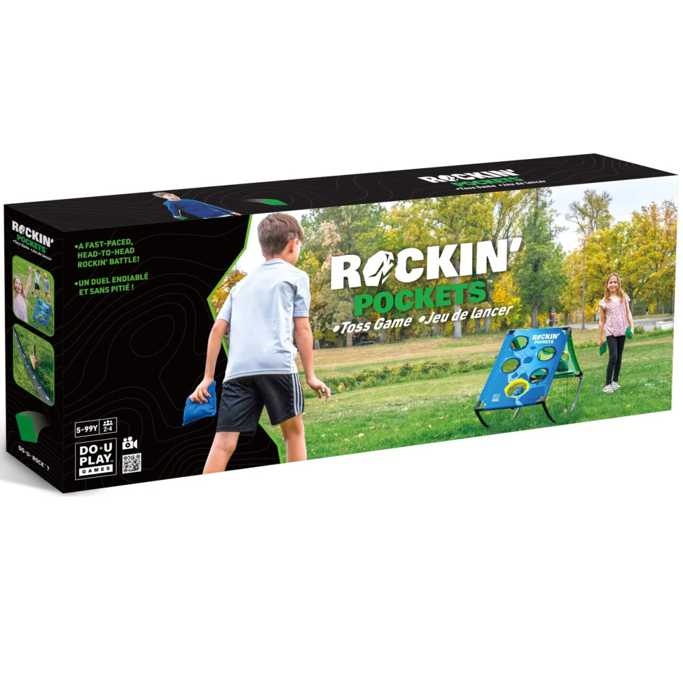 Inspired by the classic game of cornhole, Rockin' Pockets introduces an exhilarating rocking mechanism to amp up the fun indoors or outdoors. Players face off from opposite sides and simultaneously toss their 6 bags towards the pockets. Each successful throw tips the scale, causing the target to rock towards the player's direction. The last bag is twice as heavy, so throw carefully! Points are scored based on the target's leaning angle after each round and the first player/team to 25 points wins. For 2-4 players.
