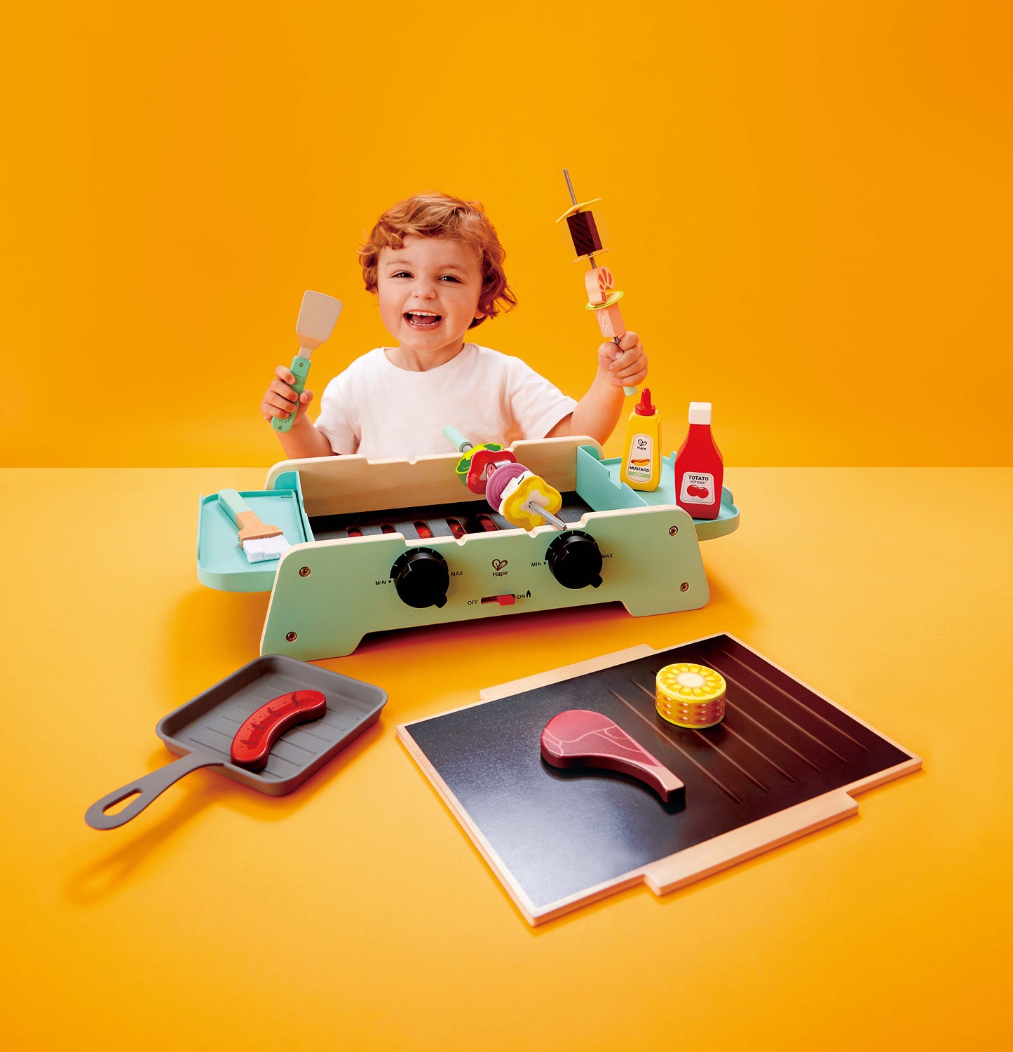 Heat up imaginative play this Fall with a wooden grill set! It includes everything little chefs need to throw the best pretend play BBQ: spatula, brush, kebab skewer, frying pan, condiments, and wooden and felt food items. The barbe-cute grill features a reversible food prep surface and an eye-catching hot charcoal effect. The spatula makes realistic sizzling sounds, and the dials really turn! Measuring 14" x 8" x 3.5", it's an ideal size for tucking away when not in use, and all the accessories store underneath. Requires 2 cell batteries, included.