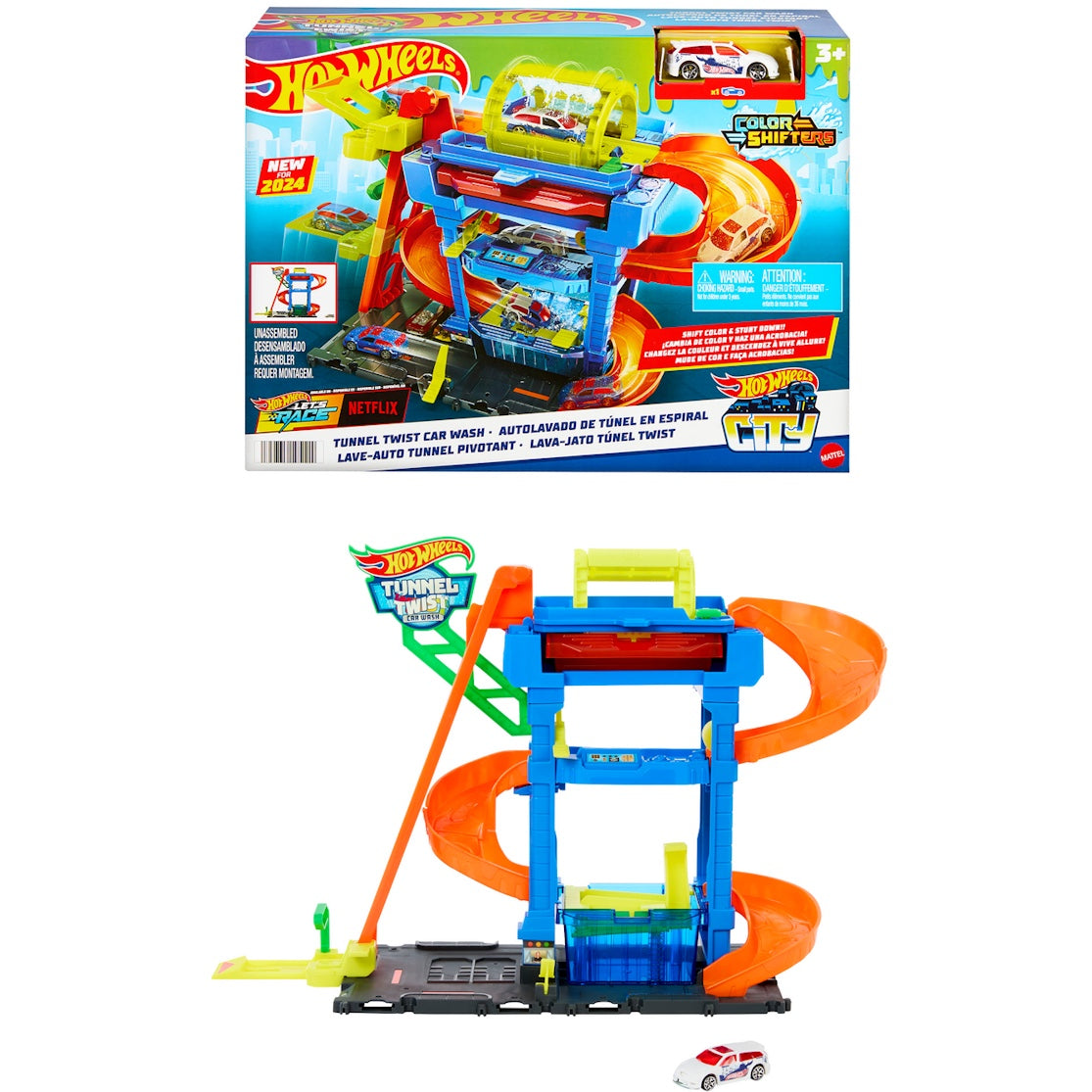 Put the magical experience of a car wash into the hands of your preschooler! This cleverly constructed multi-level Hot Wheels building inspires hours of imaginary play. Car-obsessed kids load the included Color Shifter car onto the elevator and up to the top level. Spin the wash tunnel filled with warm water and watch the car magically change color! Zoom down the ramp to the sponge roller, and down to ground level into the cold water bath to change the car color back again. Worried about a mess? The convenient water trays prevent spills and collect excess water!