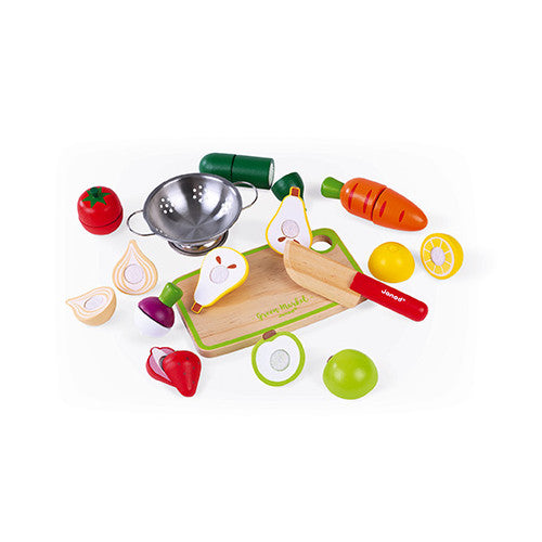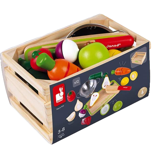 Wooden toy. For children aged 3-8 years. This market crate contains 9 fruits and vegetables to chop up (onion, courgette, carrot, tomato, turnip, pear, lemon, apple and strawberry) as well as a cutting board, knife and colander. It’s everything your child will need to create excellent make-believe dishes. Delivered shrink-wrapped.