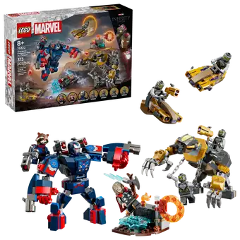 Based on an iconic Marvel Avengers movie battle scene, this buildable Super Hero set includes 2 big LEGO figures: the Iron Patriot mech, which incorporates 4 stud shooters, and a fearsome Chitauri gorilla. Both are jointed for dynamic play. There are 7 minifigures: Iron Patriot MK2; Rocket with a large stud shooter; Thor with Stormbreaker; and 4 Chitauri, 2 of which have golden stud shooters. Other features include 2 jet scooters and a small environment for Thor, where spare shooter studs can be stored. This build-and-play set connects to Avengers: Endgame Final Battle (76323) for a larger play experience. Builders can also zoom in and rotate models in 3D using the fun, intuitive LEGO Builder app. Contains 373 pieces.