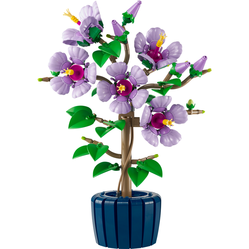 Enjoy building the LEGO plant, which features 5 large blooms, 4 flowers that are about to blossom and 2 young flower buds, before discovering the details. Capturing the gentle beauty of nature, the large blooms have lavender-colored petals and yellow stamens, while the leaves are pale green. Once you've finished building the hibiscus, you can move the petals and position the leaves to add a touch of customization to your creation.