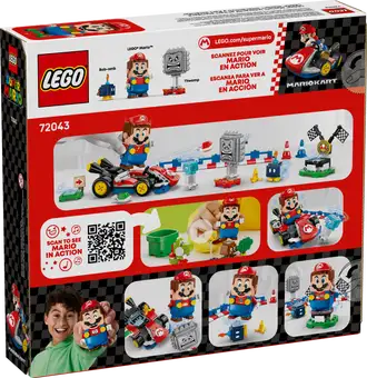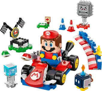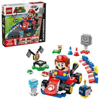 Let kids create their own racetrack and team up with LEGO Mario in his Standard Kart for interactive races with this brick-built Mario Kart toy playset (72043). A fantastic LEGO Super Mario gift toy for boys, girls and gamers aged 7 years old and up, the building set features an interactive LEGO Mario toy figure and a Standard Kart with drifting action and a shell-launching function for racing fun and pretend play. There is a start area, connectible track barriers, traffic cones and a winner's circle to make a racetrack. Drive the Standard Kart with LEGO Mario to trigger Mario Kart sounds and visual effects, earn digital rewards from the Item Box, defeat the Bob-omb and Thwomp and see how LEGO Mario reacts to the green and red LEGO plates.