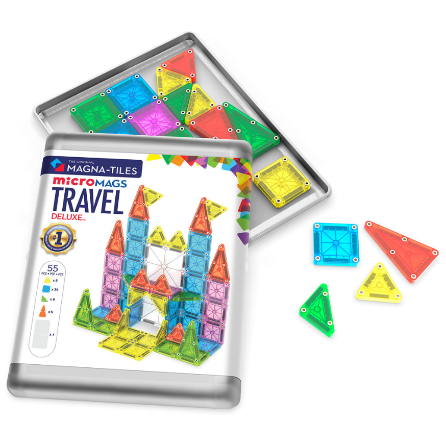 Click, connect, sort, stack, match... build STEAM skills while traveling with an en-tile-ly unique building experience! There's no wrong way to play with this handy set of 55 colorful magnetic shapes that are 75% smaller than classic MAGNA-TILES. Pack the 4" x 8" travel tin in a purse, backpack, or car door pocket for screen-free entertainment on the go. Compatible with all MAGNA-TILES sets for world building.